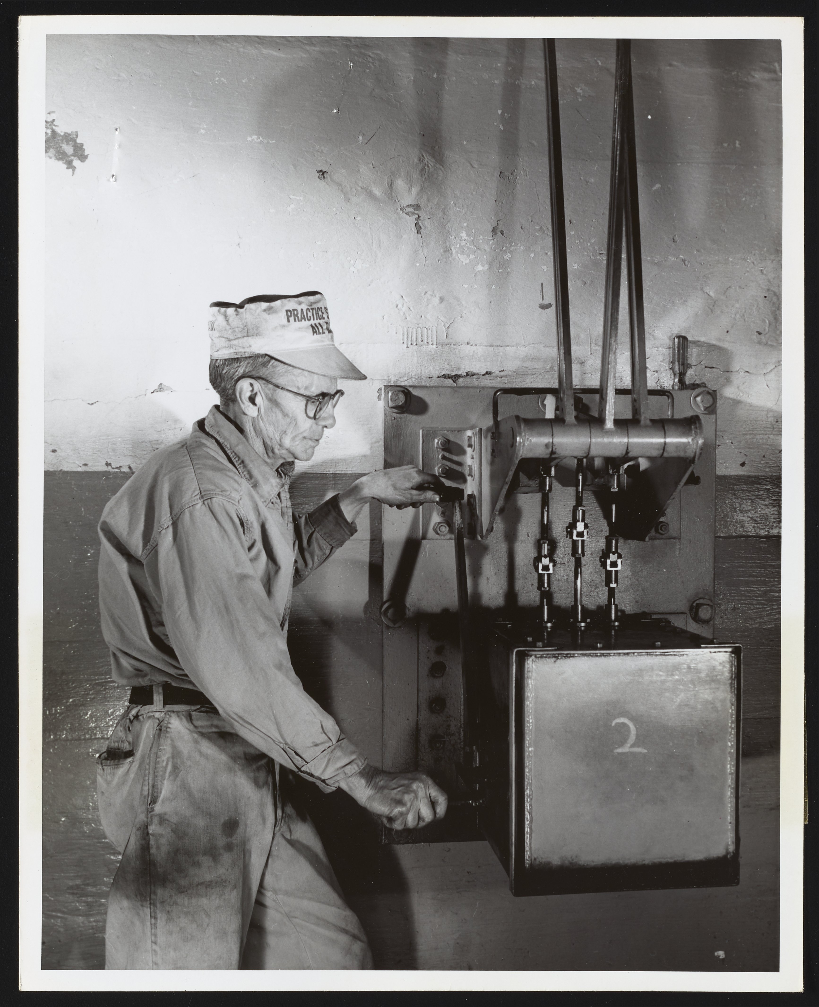 General view of mix house group leader Benny Williams mixing Pentaerythritol tetranitrate (PETN) with graphite for use in the electric blasting caps produced at the Hercules Powder Company plant in Port Ewen, New York. Williams is seen operating a series of levers in order to mix the PETN on a rubber mat positioned on the other side of the concrete wall. Notably, rubber was used to transfer and mix the explosive powder in order to avoid the hazard of metal, which might cause a spark or a shock.