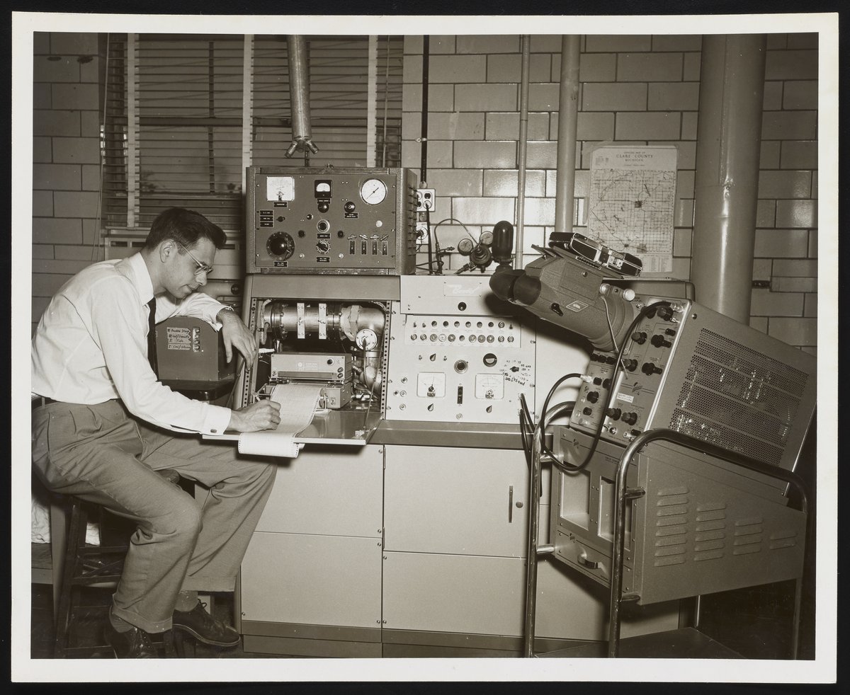 Bendix employee with assorted scientific instruments