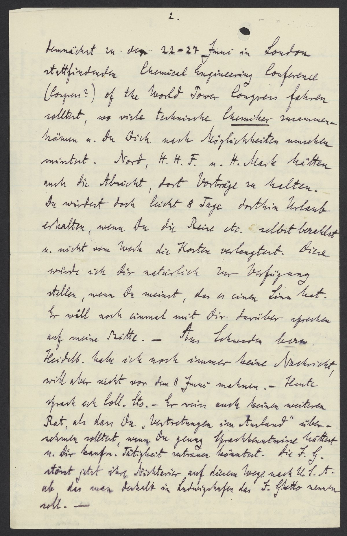 demnächst zu den 22-27 Juni in London stattfindenden Chemical Engineering Conference (Congress?) of the World Power Congress fahren solltest, wo viele technische Chemiker zusammenkämen u. Du Dich nach Möglichkeiten umsehen müsstest. Nord, H.H.F. u. H. Mark hätten auch die Absicht, dort Vorträge zu halten. Du würdest doch leicht 8 Tage dorthin Urlaub erhalten, wenn Du die Reise etc. selbst bezahlst u. nicht vom Werk die Kosten verlangtest. Diese würde ich Dir natürlich zur Verfügung stellen, wenn Du meinst, das es einen Sinn hat. Er will noch einmal mit Dir darüber sprechen auf meine Bitte. – Aus Schweden bzw. Heidelb. habe ich noch immer keine Nachricht, will aber nicht vor dem 8. Juni mahnen. – Heute sprach ich Coll. Sto.- Er weiss auch keinen weiteren Rat, als dass Du „Vertretungen im Ausland“ übernehmen solltest, wenn Du genug Sprachkenntnisse hättest u. Dir kaufm. Tätigkeit zutrauen könntest. Die I.G. stösst jetzt ihre Nichtarier auf diesem Wegen nach U.S.A. ab, dass man deshalb in Ludwigshafen das J. Ghetto nennen soll. –