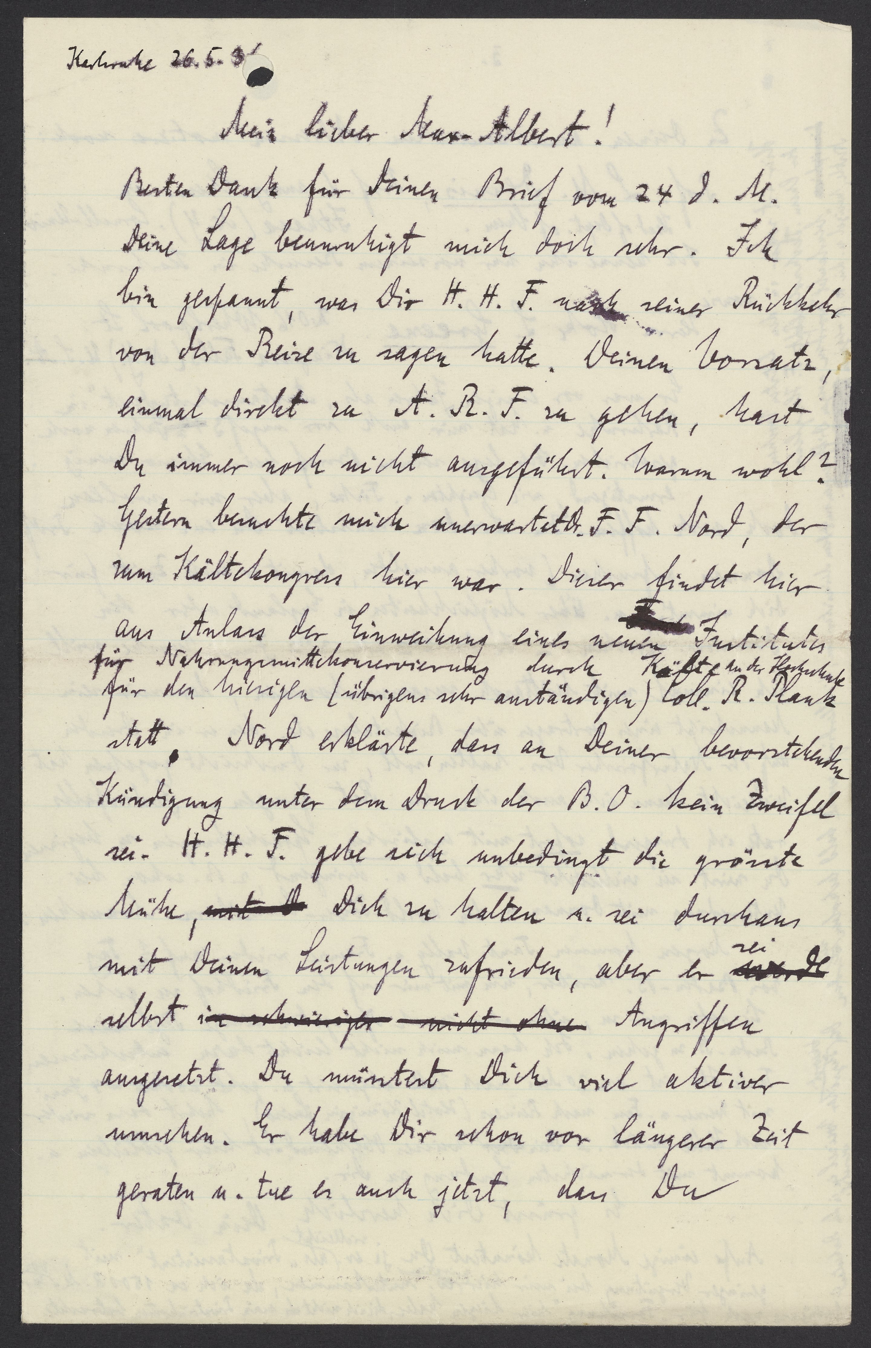 Thank you very much for your letter from May 24th. Your situation worries me very much. I’m curious to find out what H.H.F said to you after he returned from his trip. You still haven’t carried out your plan to go directly to A.R.F. Why? Yesterday, F.F. Nord unexpectedly visited me. He was here for the refrigeration convention, which is happening here during the inauguration of a new Institute for Cold Food Preservation at the university for my local (and very respectable, by the way) colleague, R. Plank. Nord reports that your early termination under pressure from the B.O. is certain. H.H.F is making every effort to keep you and is probably satisfied with your performance, but he is also under attack. You should look around a lot more actively. He suggested this a long time ago, and now you should do this, especially