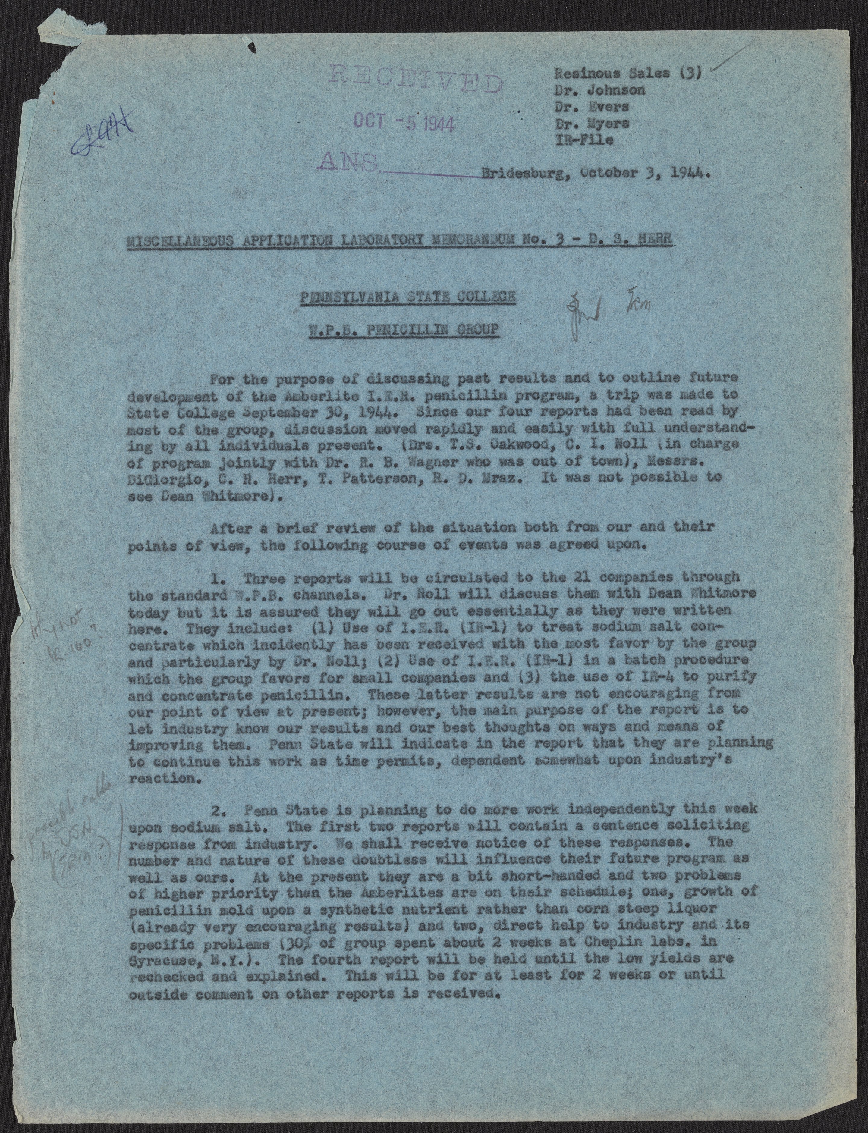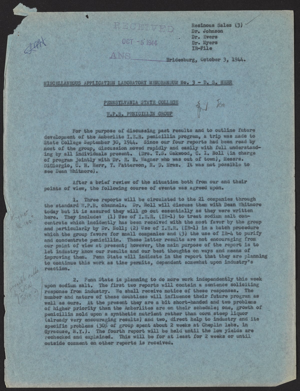 Herr, Donald S. “Miscellaneous Application Laboratory Memorandum No. 3,” October 3, 1944. Rohm & Haas Penicillin Papers, Folder 1. Science History Institute. Philadelphia. https://digital.sciencehistory.org/works/387ncsp.
