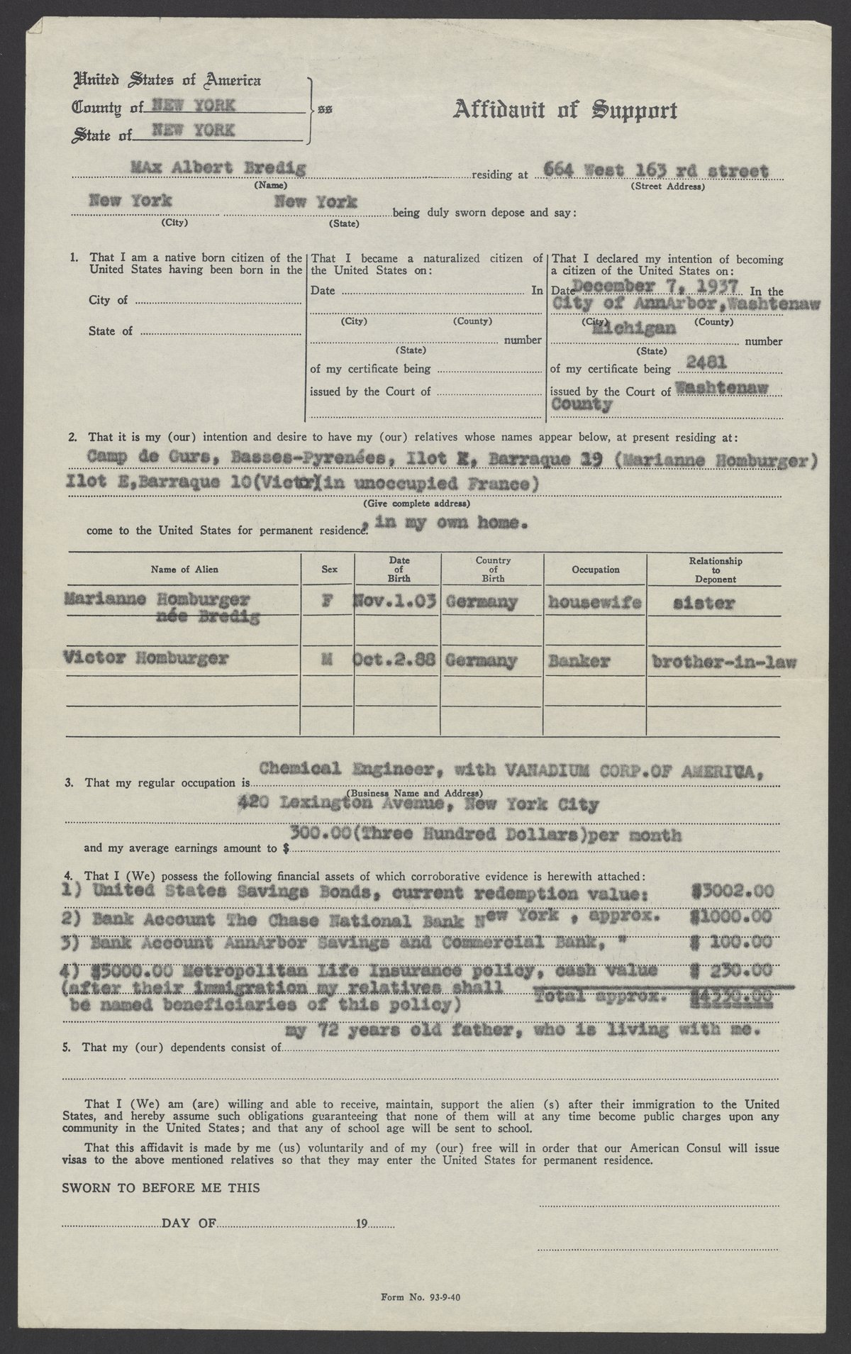 Bredig, Max Albert. “Affidavit for Viktor and Marianne Homburger by Max Bredig,” circa 1939. Papers of Georg and Max Bredig, Box 10, Folder 30. Science History Institute. Philadelphia. https://digital.sciencehistory.org/works/38yom9c.