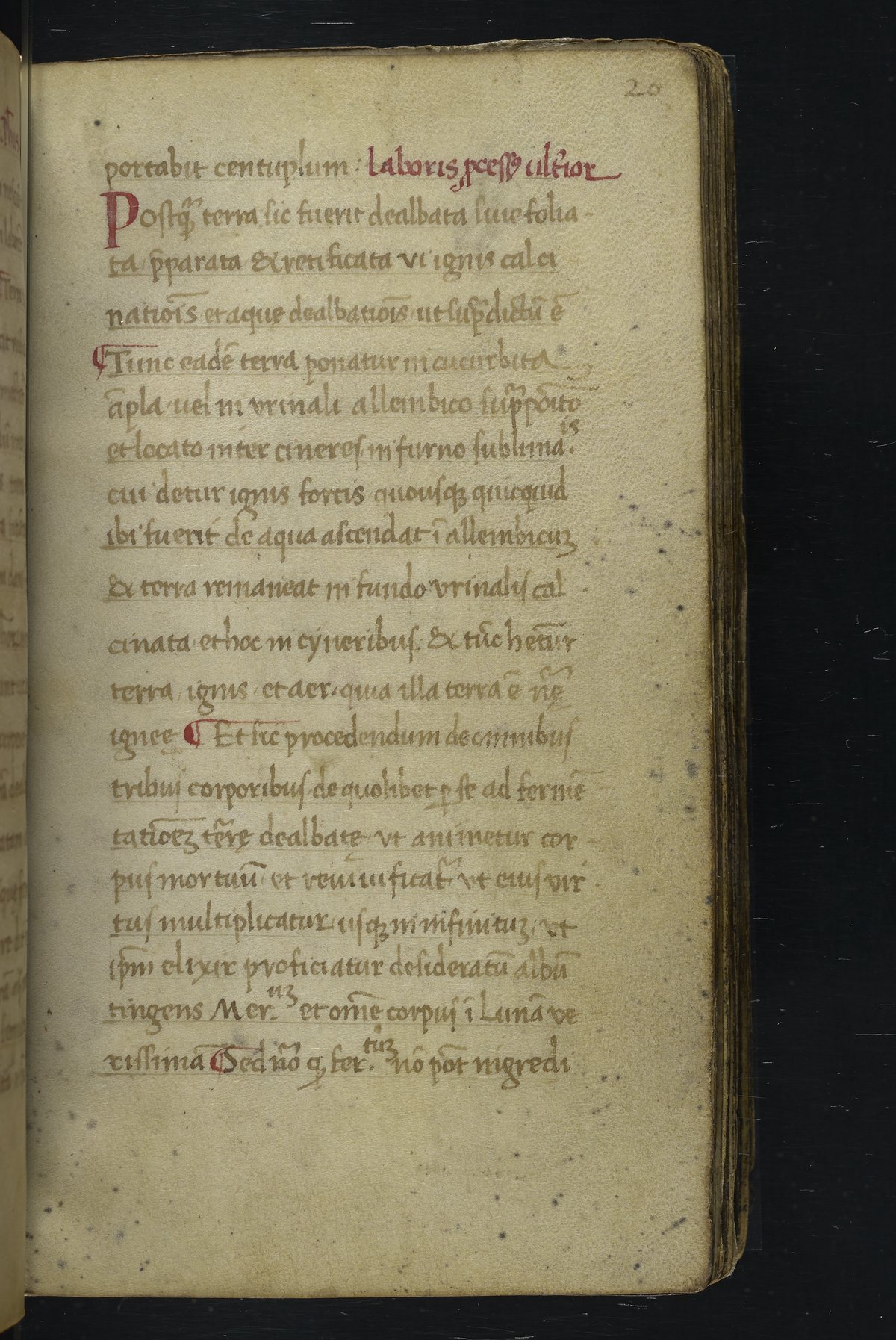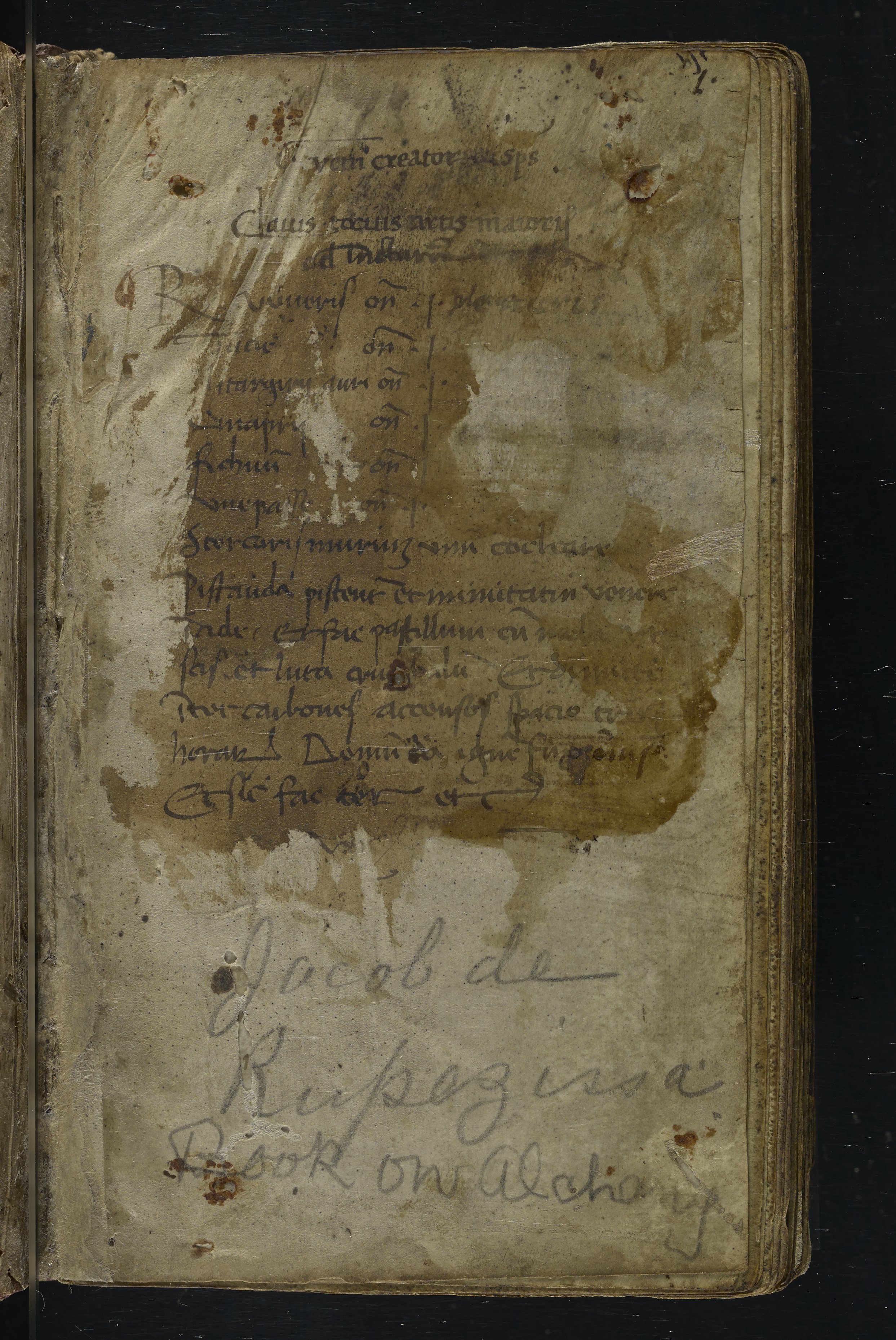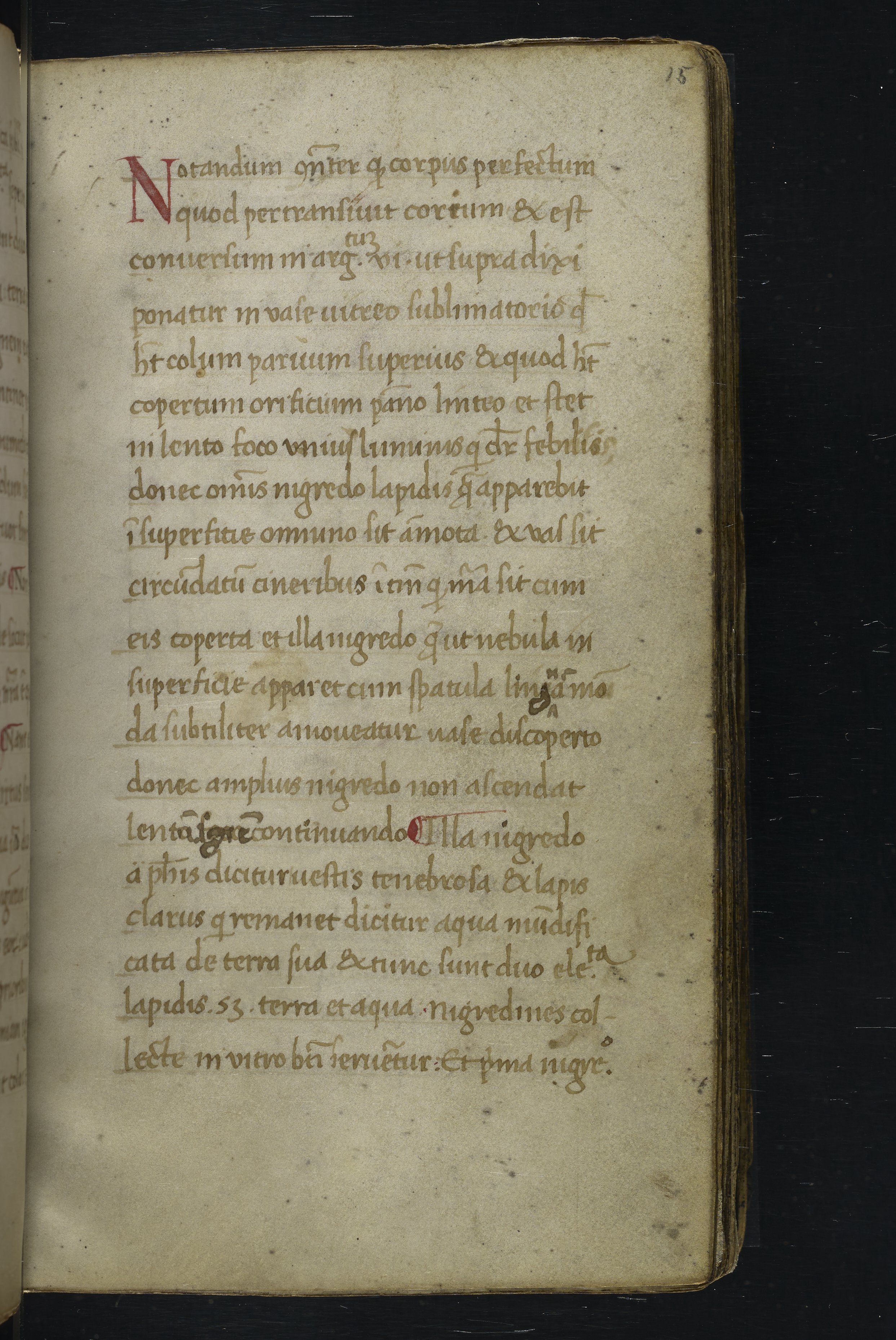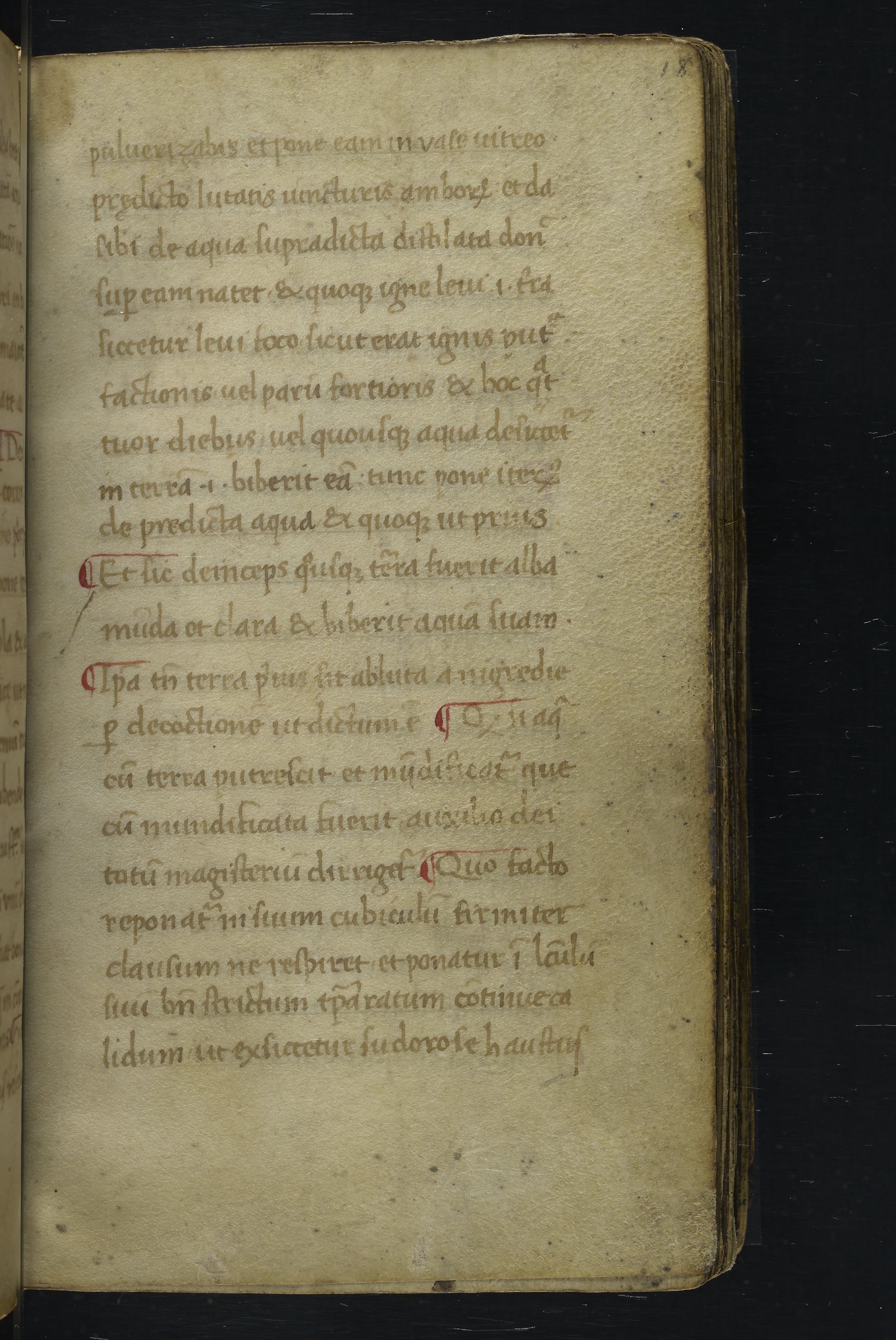 Small JPG1200 x 1517px — 348 KBLarge JPG2880 x 3640px — 1.8 MBFull-sized JPG2940 x 3716px — 1.9 MBOriginal fileTIFF — 2940 x 3716px — 31.3 MBThis manuscript is an important miscellany of practical and theoretical alchemical texts with a full-page drawing of alchemical instruments reflecting the activities of a fifteenth-century alchemist. The manuscript was written in Italy, probably Northern Italy, most likely in the third quarter of the fifteenth century, circa 1450-1475, based on the evidence of the script. Notably, at least part of the manuscript is a palimpsest (copied on previously used parchment, with the original script scraped and/or washed away). The manuscript also bears signs of being heavily used, especially on folios with practical recipes, which are remarkably soiled.