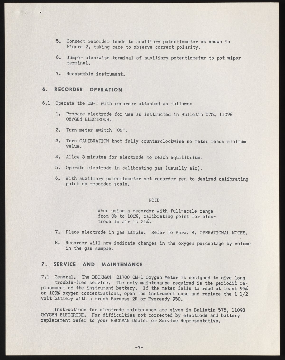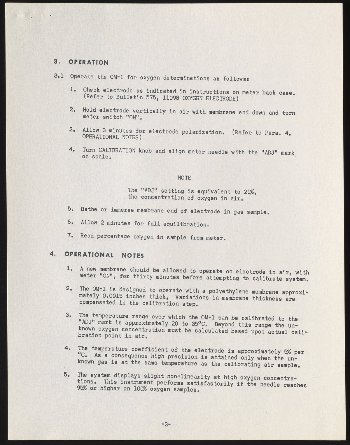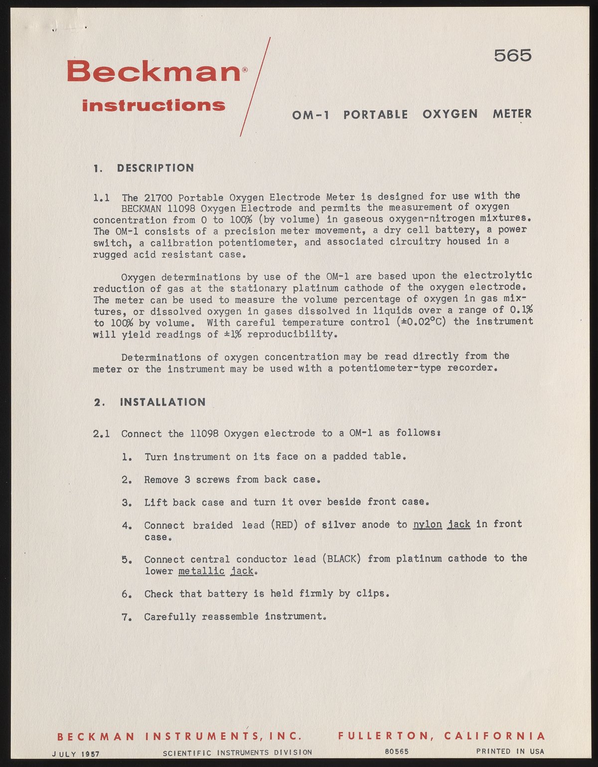 “Instructions, OM-1 Portable Oxygen Meter,” July 1957. Beckman Historical Collection, Box 105, Folder 121. Science History Institute. Philadelphia. https://digital.sciencehistory.org/works/3b5918656.