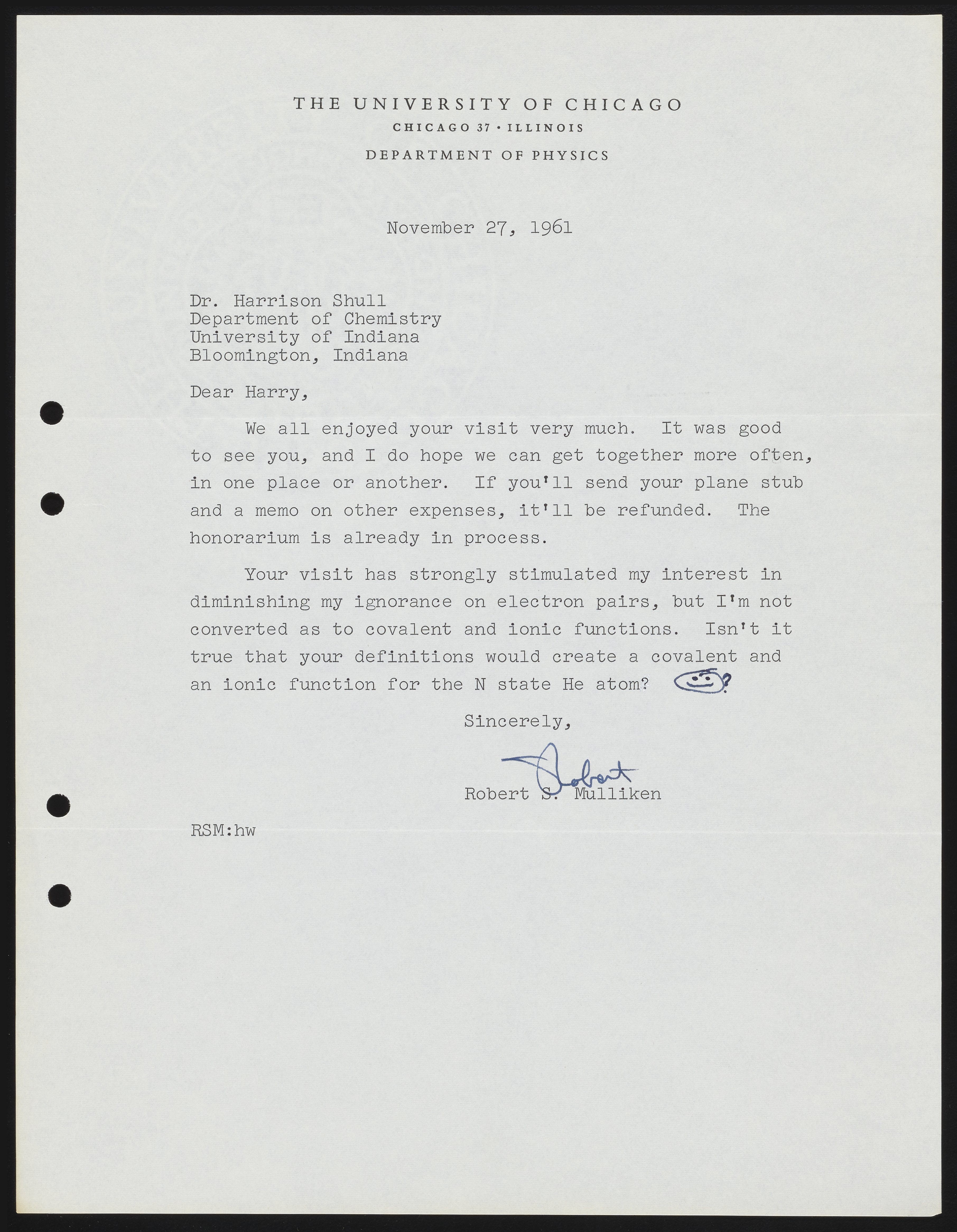 Letter from Robert S. Mulliken to Harrison Shull, 1961