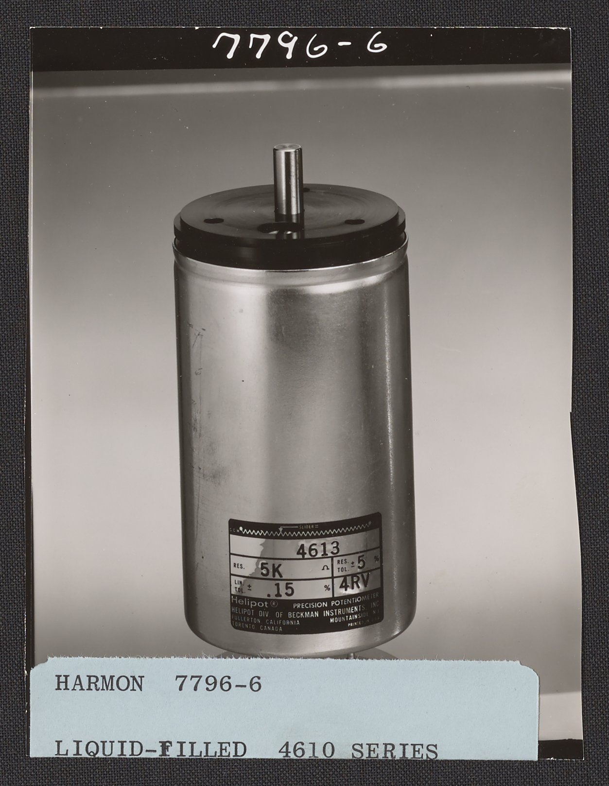 Harmon, Larry. “Helipot Liquid-Filled 4610 Series Potentiometer, Model 4613,” 1950–1969. Beckman Historical Collection, Box 86. Science History Institute. Philadelphia. https://digital.sciencehistory.org/works/3b591913n.