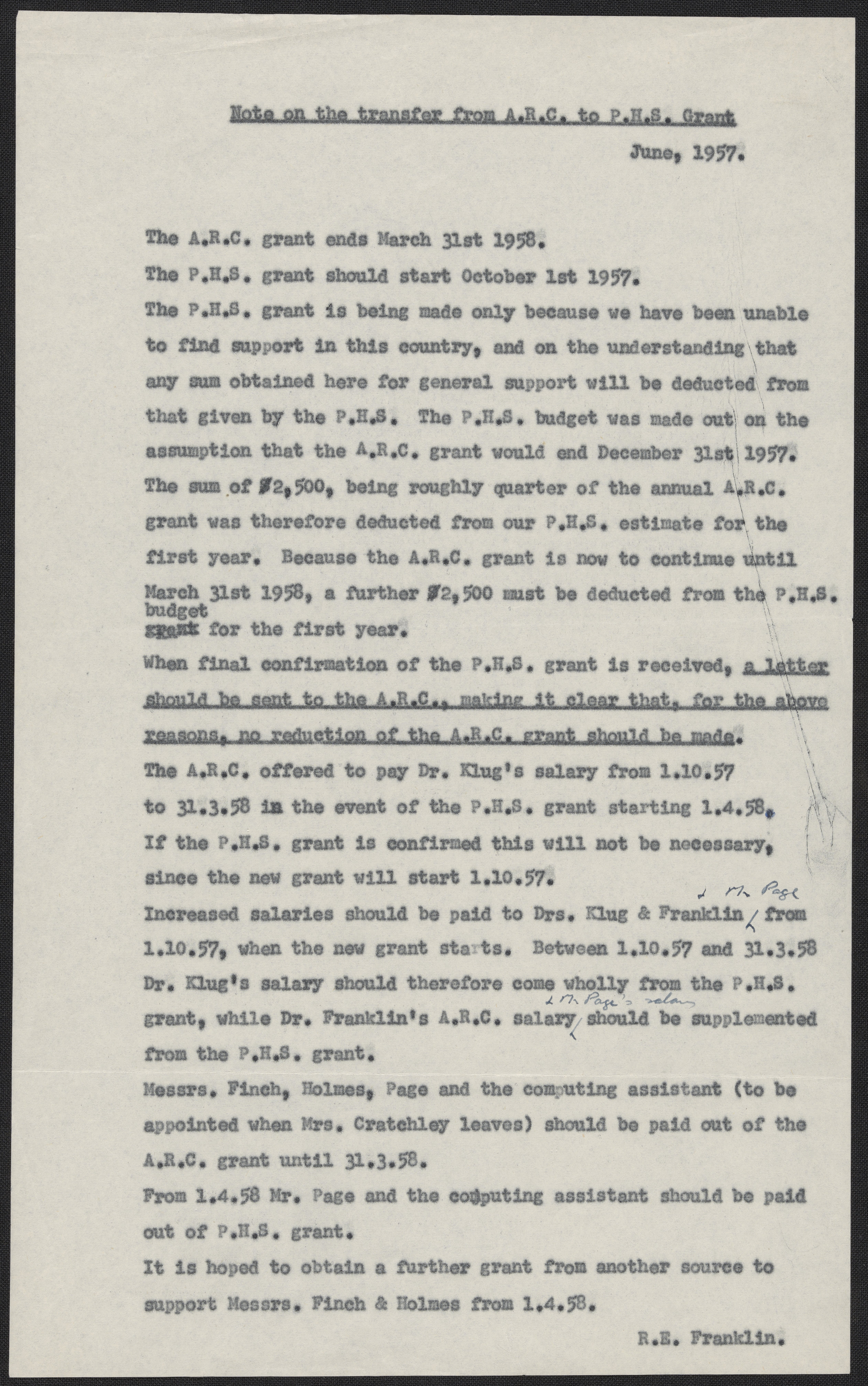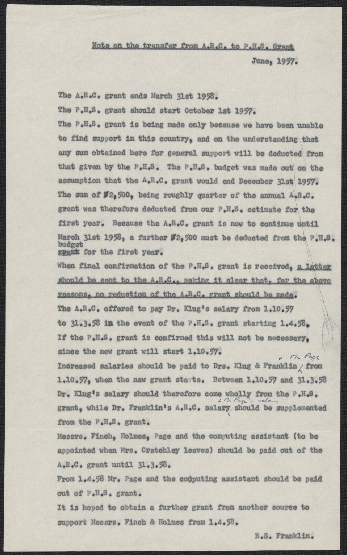 Franklin, Rosalind. “Note on the Transfer from the Agricultural Research Council to the Public Health Service Grant,” June 1957. History of Molecular Biology Collection, Box 10, Folder 12. Science History Institute. Philadelphia. https://digital.sciencehistory.org/works/3bmx7qp.