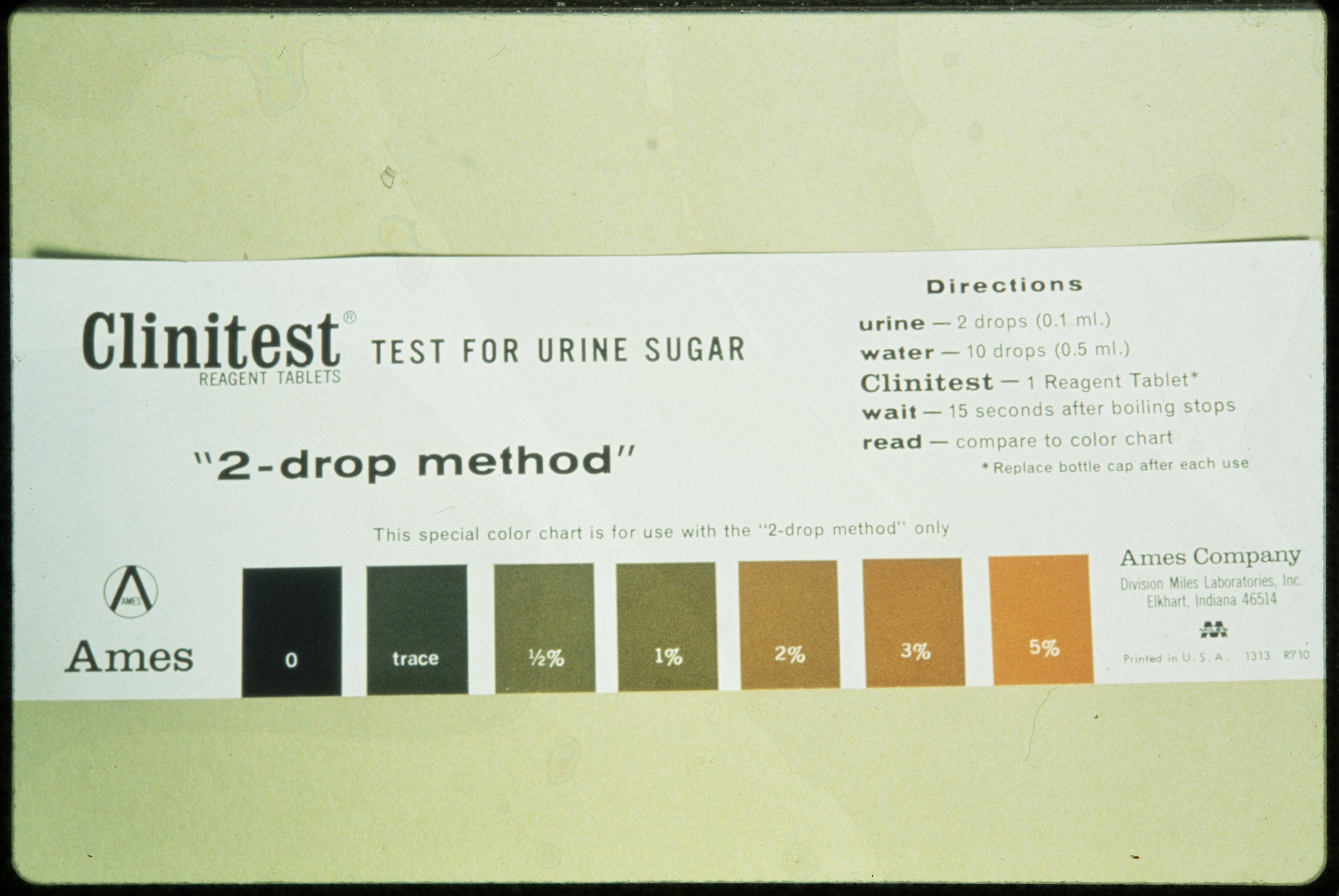 Small JPG1200 x 803px — 129 KBLarge JPG2880 x 1928px — 550 KBFull-sized JPG7552 x 5056px — 3.0 MBOriginal fileTIFF — 7552 x 5056px — 109 MBSeries of photographs depicting a test for urine sugar using Clinitest Reagent Tablets manufactured by the Ames Company. Included in the photographs are directions for conducting the test and the color chart used to analyze the result.