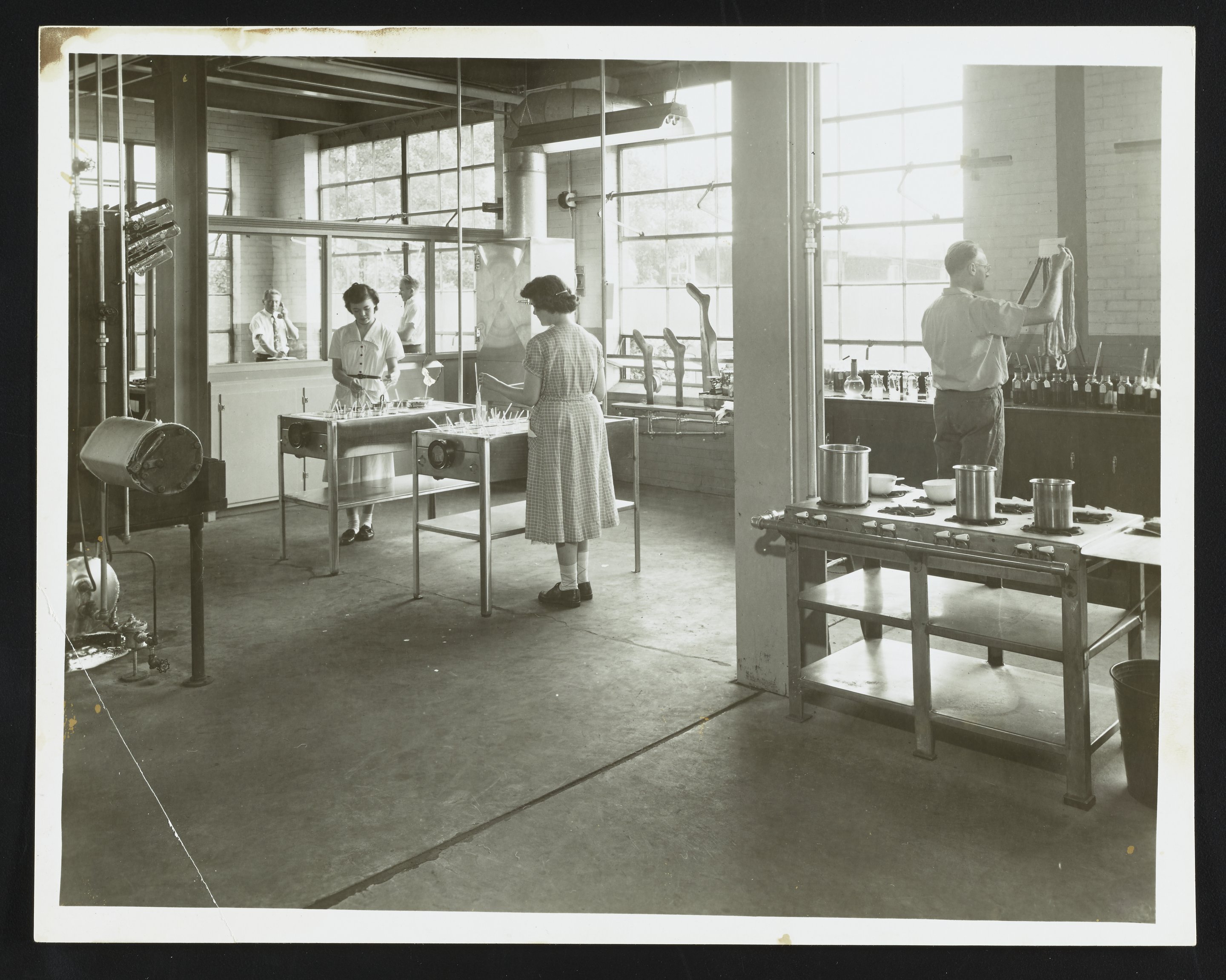 View of dyeing technicians working in the Customer Service and Quality Control Laboratory at the Althouse Chemical Company plant in Reading, Pennsylvania. The technicians are engaged in a skein dyeing process whereby lengths of yarn are dipped into a receptacle containing dye pigment. In the Althouse laboratory, this process was typically used either to test quality control of plant production lots or treat final research and development samples. Several dress forms typically used to give shape to nylon stockings are also visible near the windows.