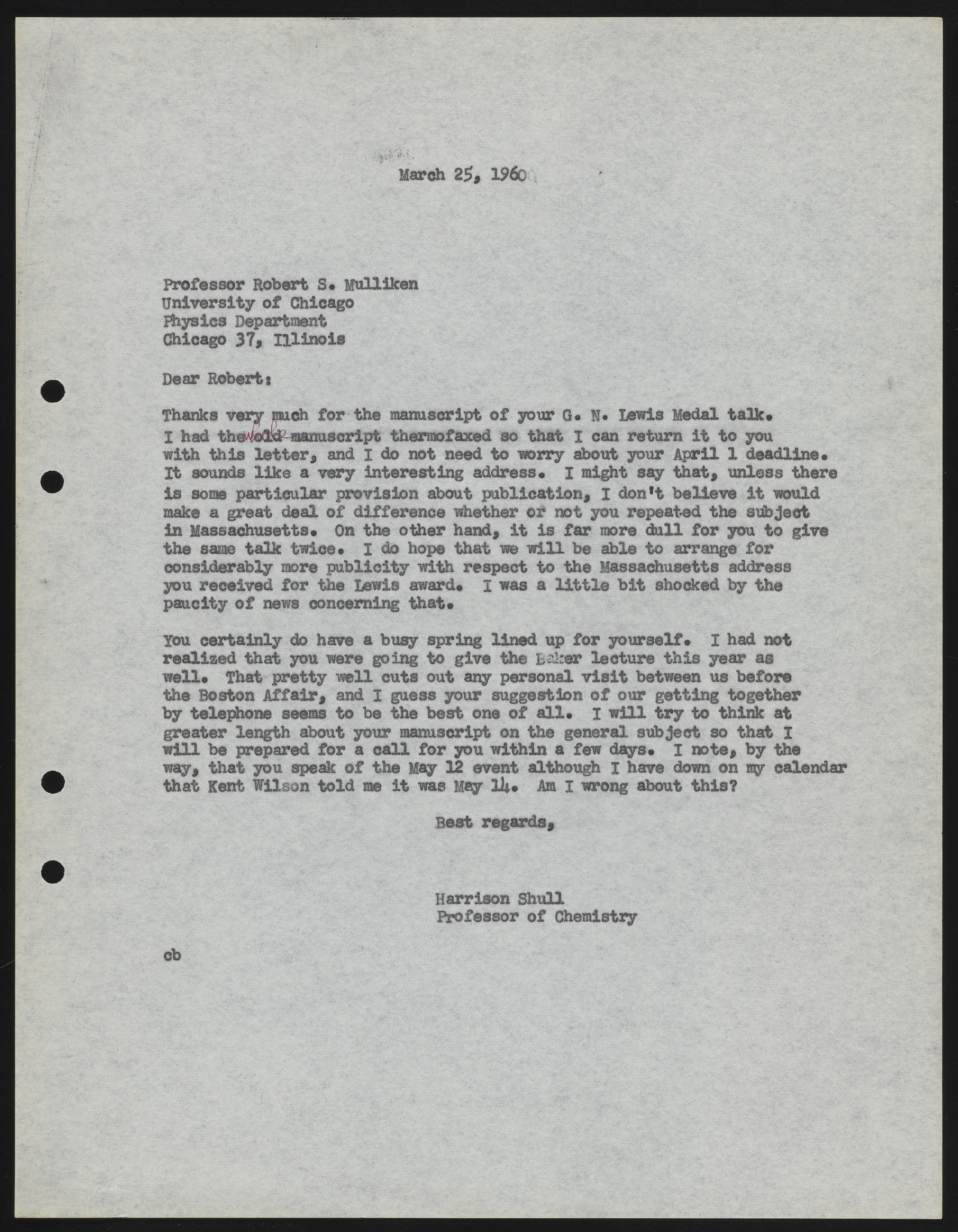 Letter between Harrison Shull and Robert S. Mulliken, American quantum chemists, concerning several lectures given and planned by Mulliken, including the G. N. Lewis Medal address and the Baker lecture.