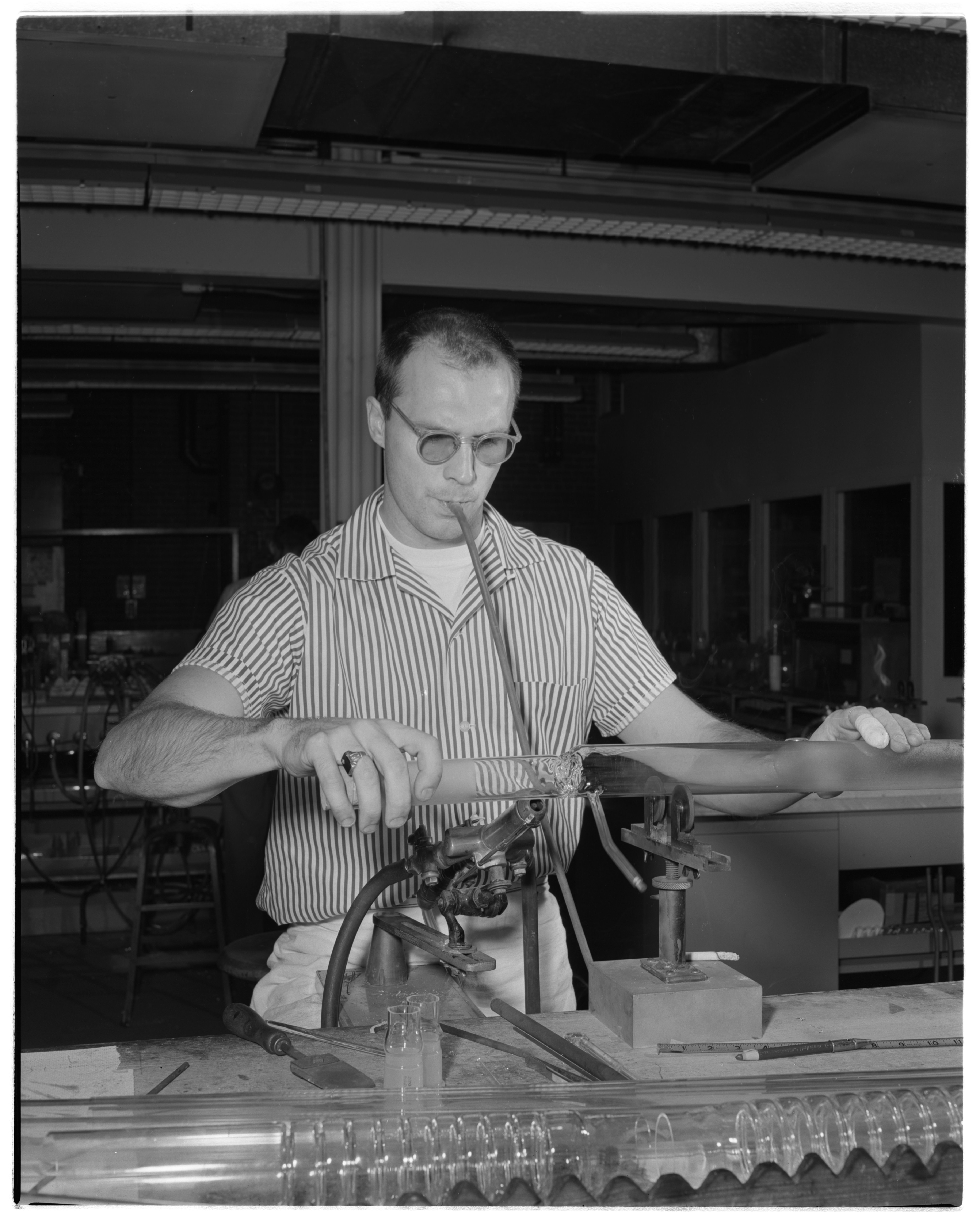 General view of glassblower Bill Schwartz applying internal pressure to fuse and close the end of a small vacuum-jacketed column in the Dow Chemical Company's Glass Fabrication department. Founded in 1925, the department was responsible for the fabrication and repair of specialty glass equipment used at the Company's plant in Midland, Michigan.