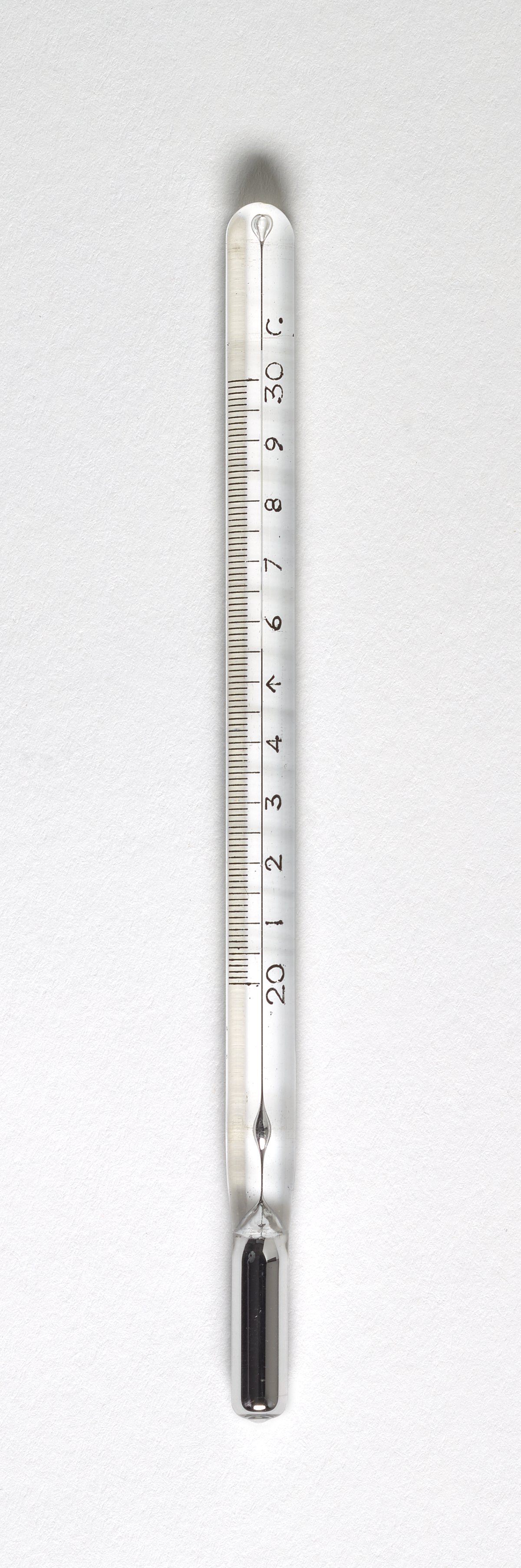 A: Bulb containing mercury attached to a glass tube of narrow diameter. Thermometer has Celsius scale with 20-30 degree range with major divisions every 1 degree and minor divisions every 0.1 degree.