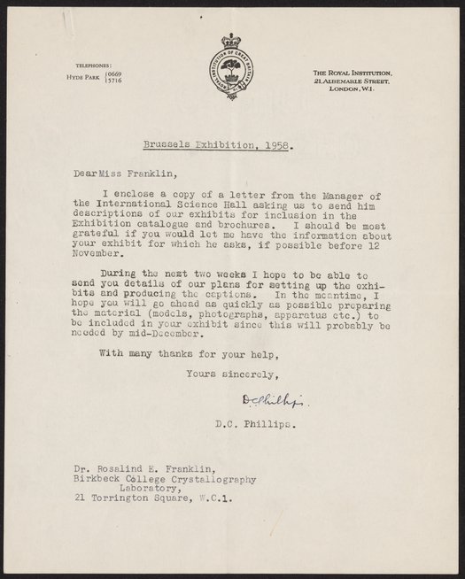 Letter from David Chilton Phillips (1924-1999) to Rosalind Franklin (1920-1958) regarding an exhibit of helical and spherical viruses to be shown at the 1958 Brussels World's Fair. Phillips forwards a letter from the manager of the International Science Hall, Jean Rasse, detailing the requirements for the exhibition descriptions and catalogue.