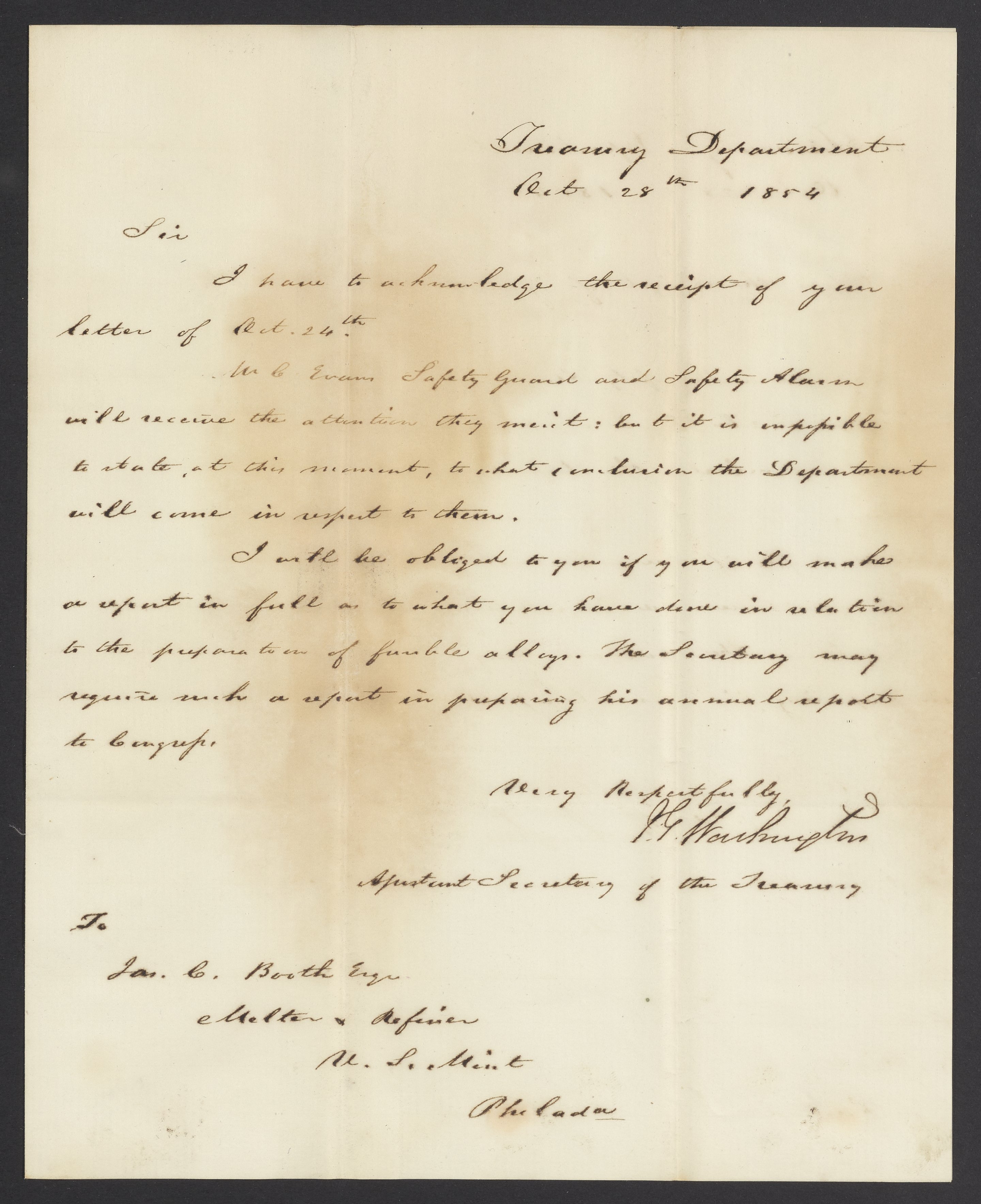 Small JPG1200 x 1474px — 177 KBLarge JPG2880 x 3537px — 984 KBFull-sized JPG3332 x 4092px — 1.3 MBOriginal fileTIFF — 3332 x 4092px — 39.1 MBJ. G. Washington, of the United States Treasury Department, writes to James Curtis Booth (1810-1888) to discuss the possible use of Evans Safety Guards and Safety Alarms.