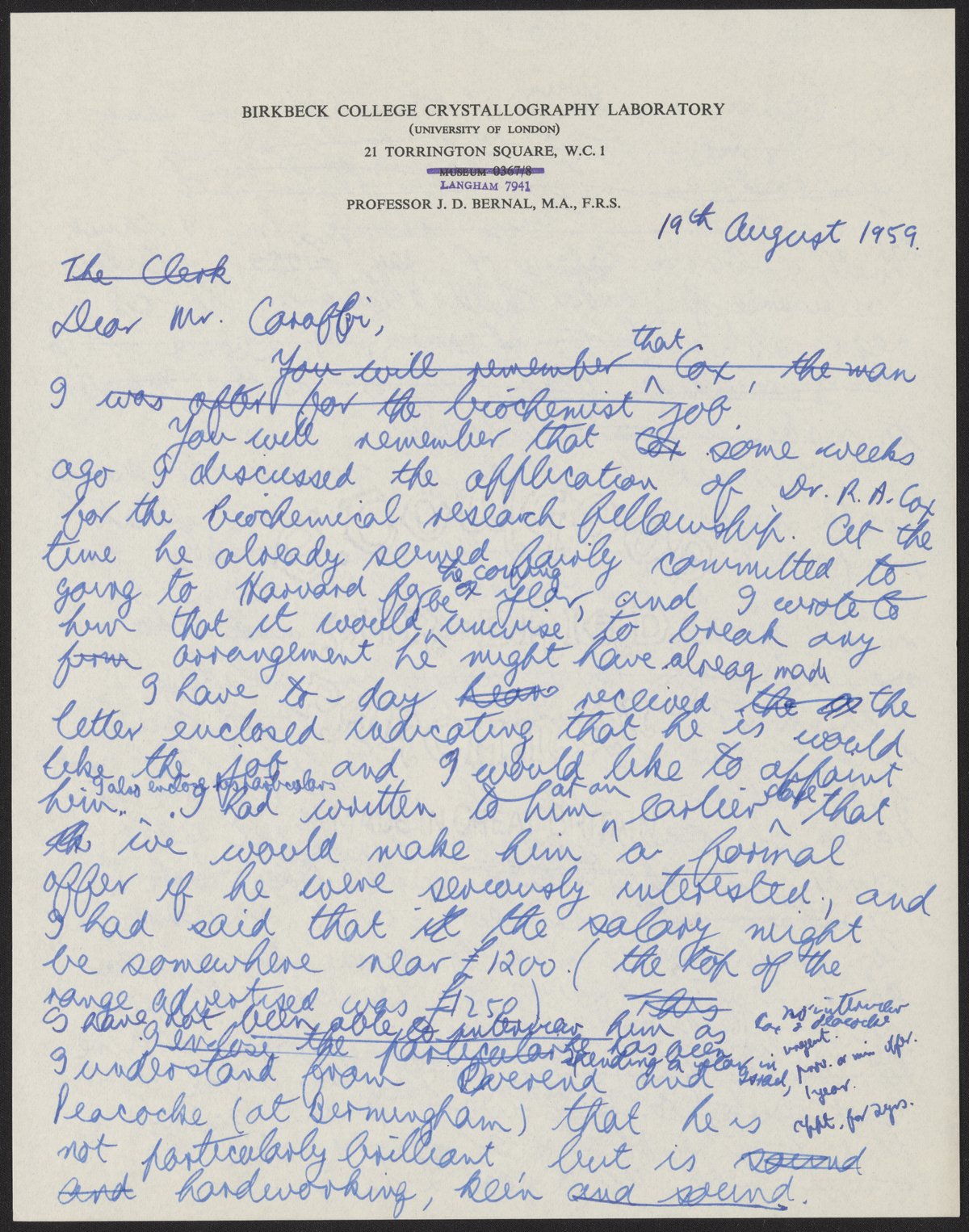 Klug, A. (Aaron), Sir. “Letter from Aaron Klug to A. J. Caraffi, August 19, 1959,” August 19, 1959. History of Molecular Biology Collection, Box 17, Folder 12. Science History Institute. Philadelphia. https://digital.sciencehistory.org/works/3i6xdtz.
