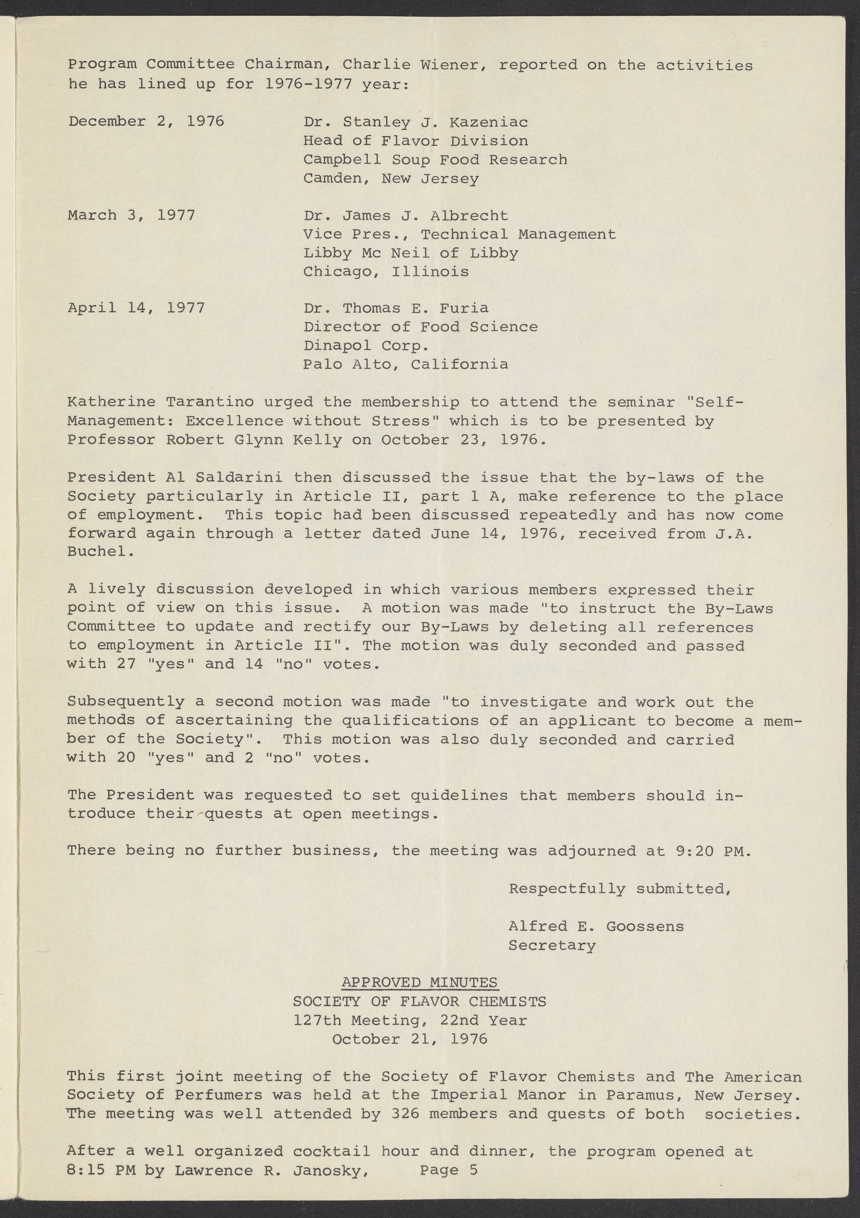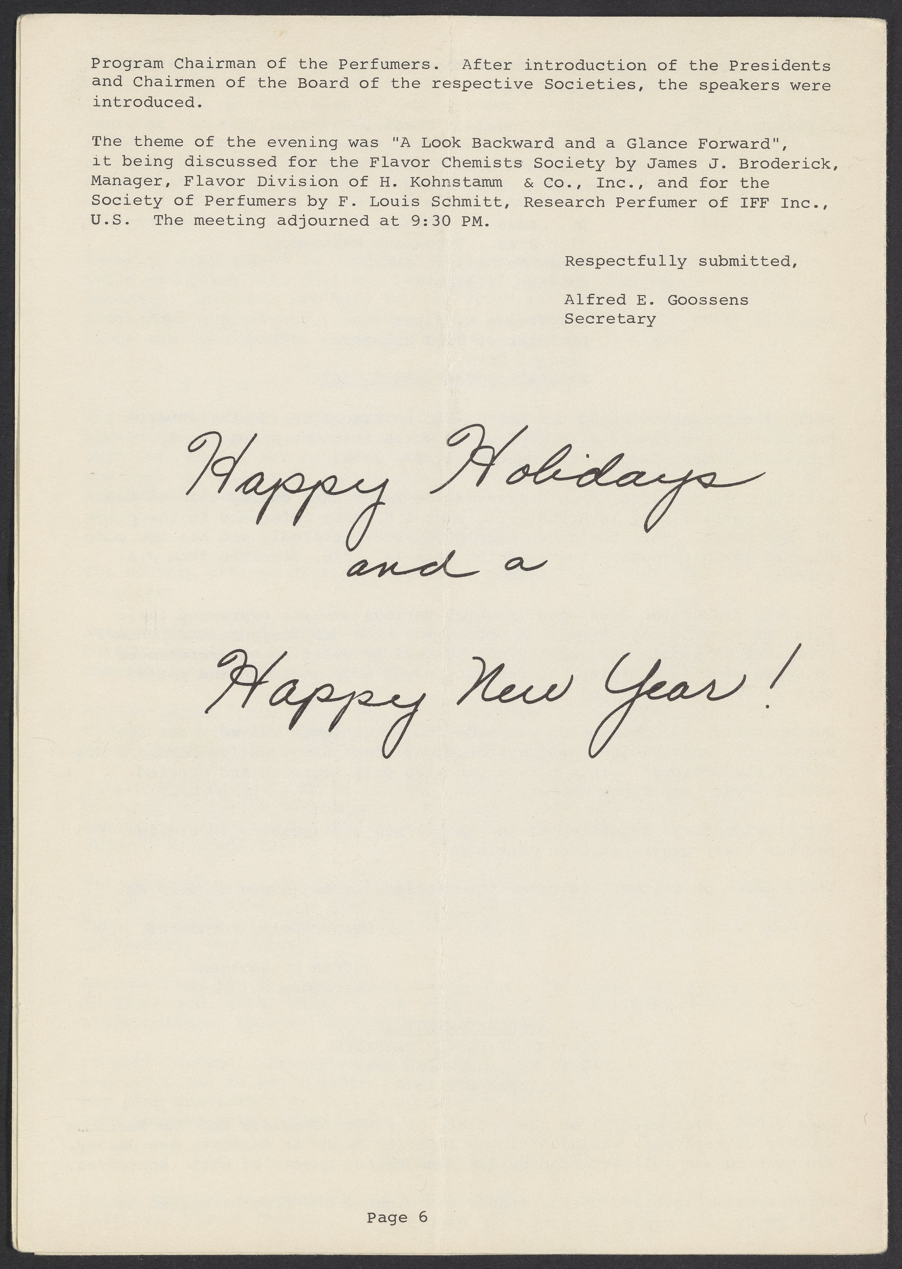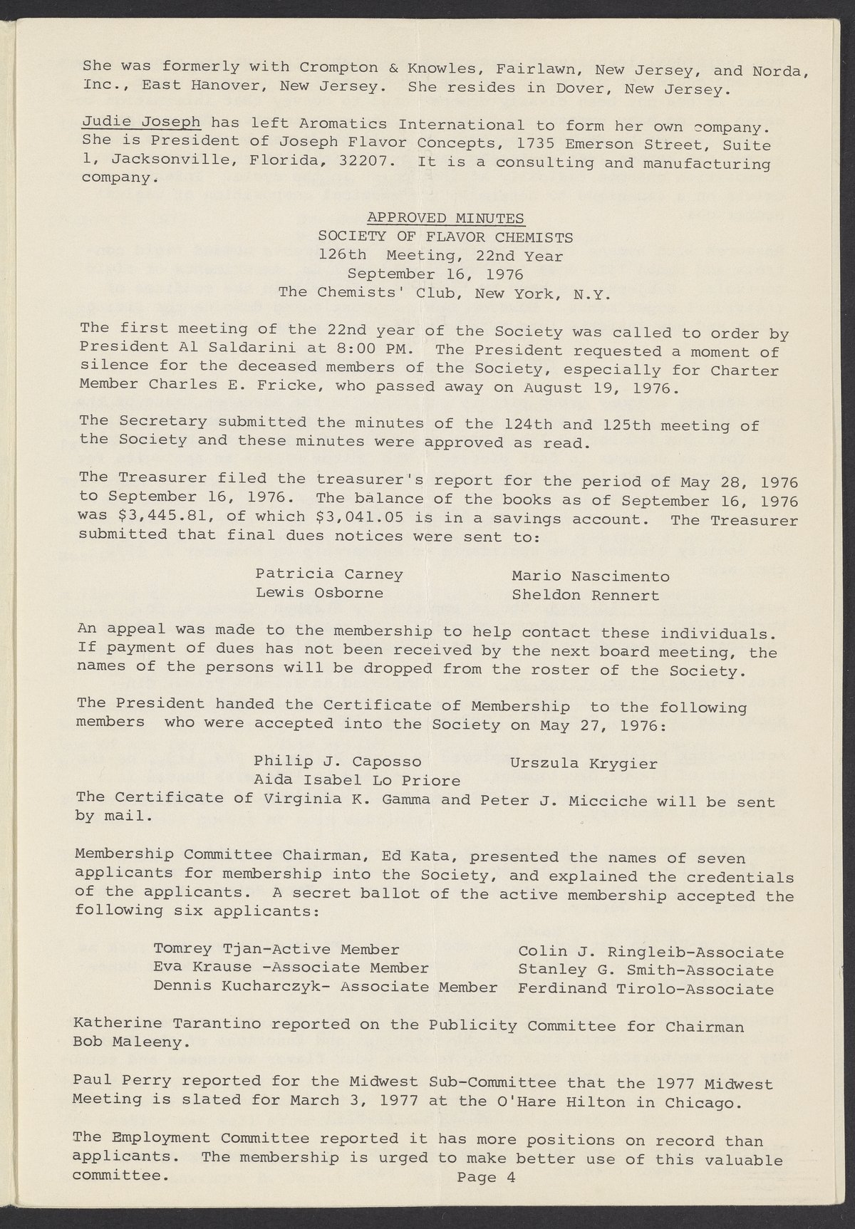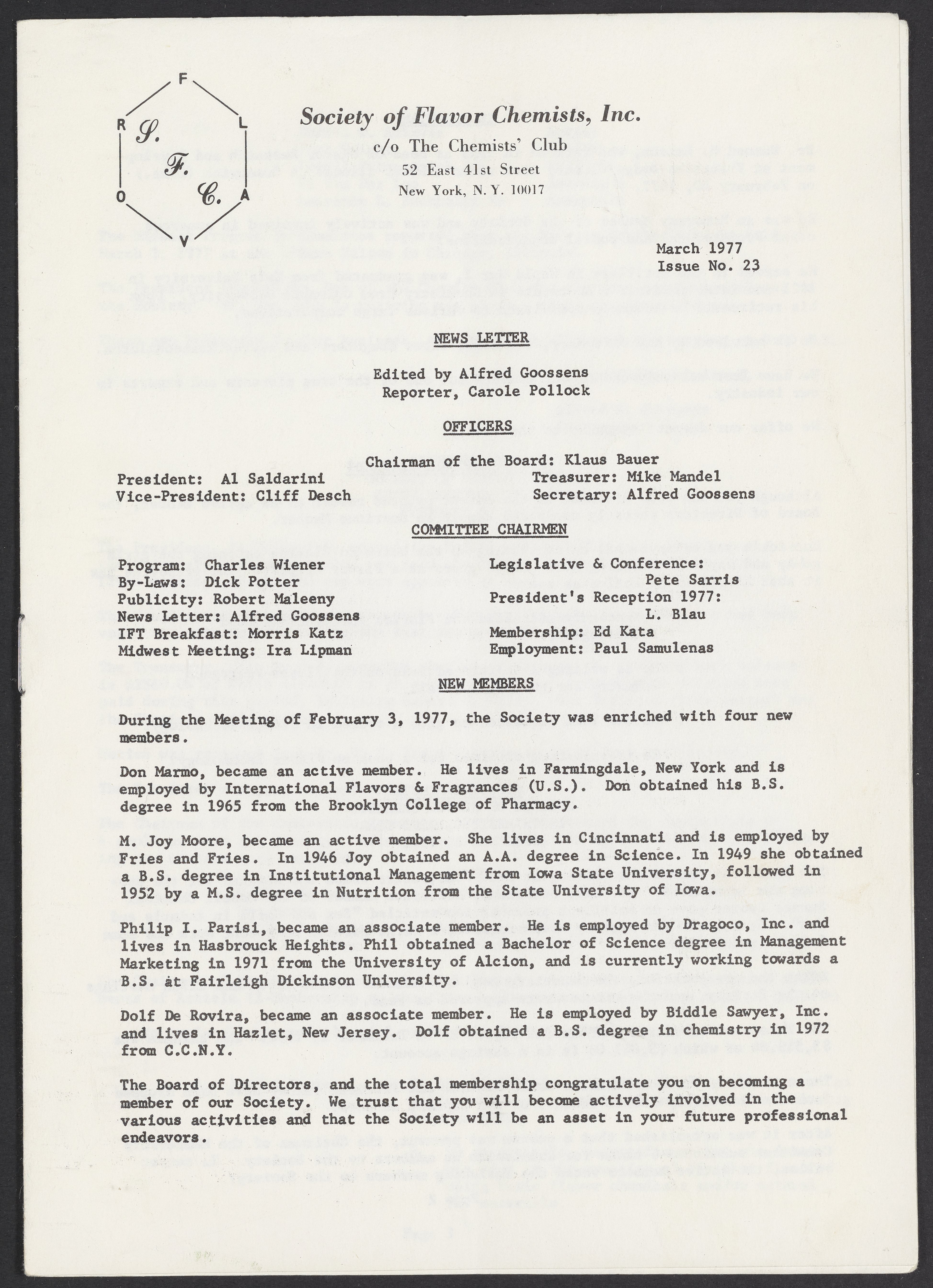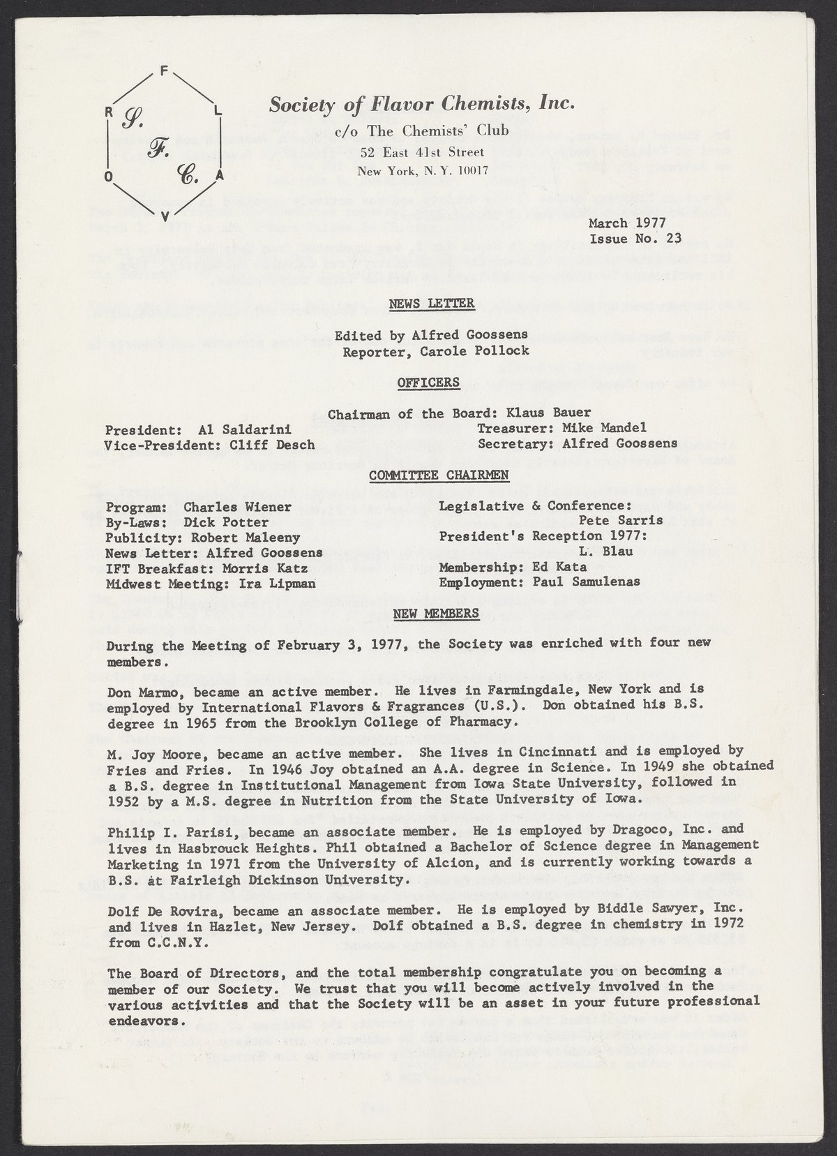 Society of Flavor Chemists. “Society of Flavor Chemists Newsletter, December 1976,” December 1976. Society of Flavor Chemists Newsletters and Certificate of Incorporation, Box 1, Folder 1. Science History Institute. Philadelphia. https://digital.sciencehistory.org/works/3k2x1h1.