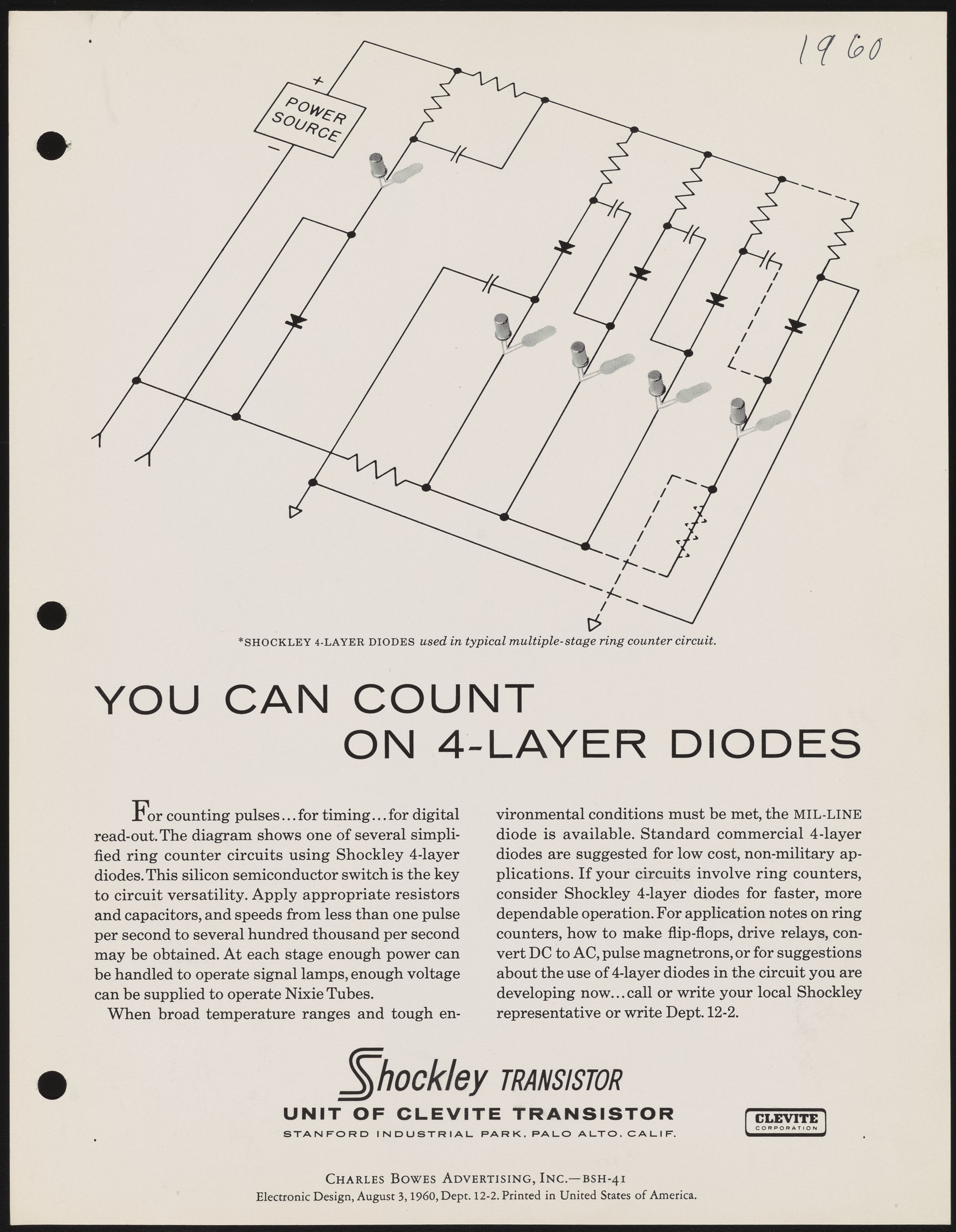 Clevite Transistor, and Charles Bowes Advertising. “You Can Count on 4-Layer Diodes,” 1960. Beckman Historical Collection, Box 49, Folder 18. Science History Institute. Philadelphia. https://digital.sciencehistory.org/works/3n203z084.