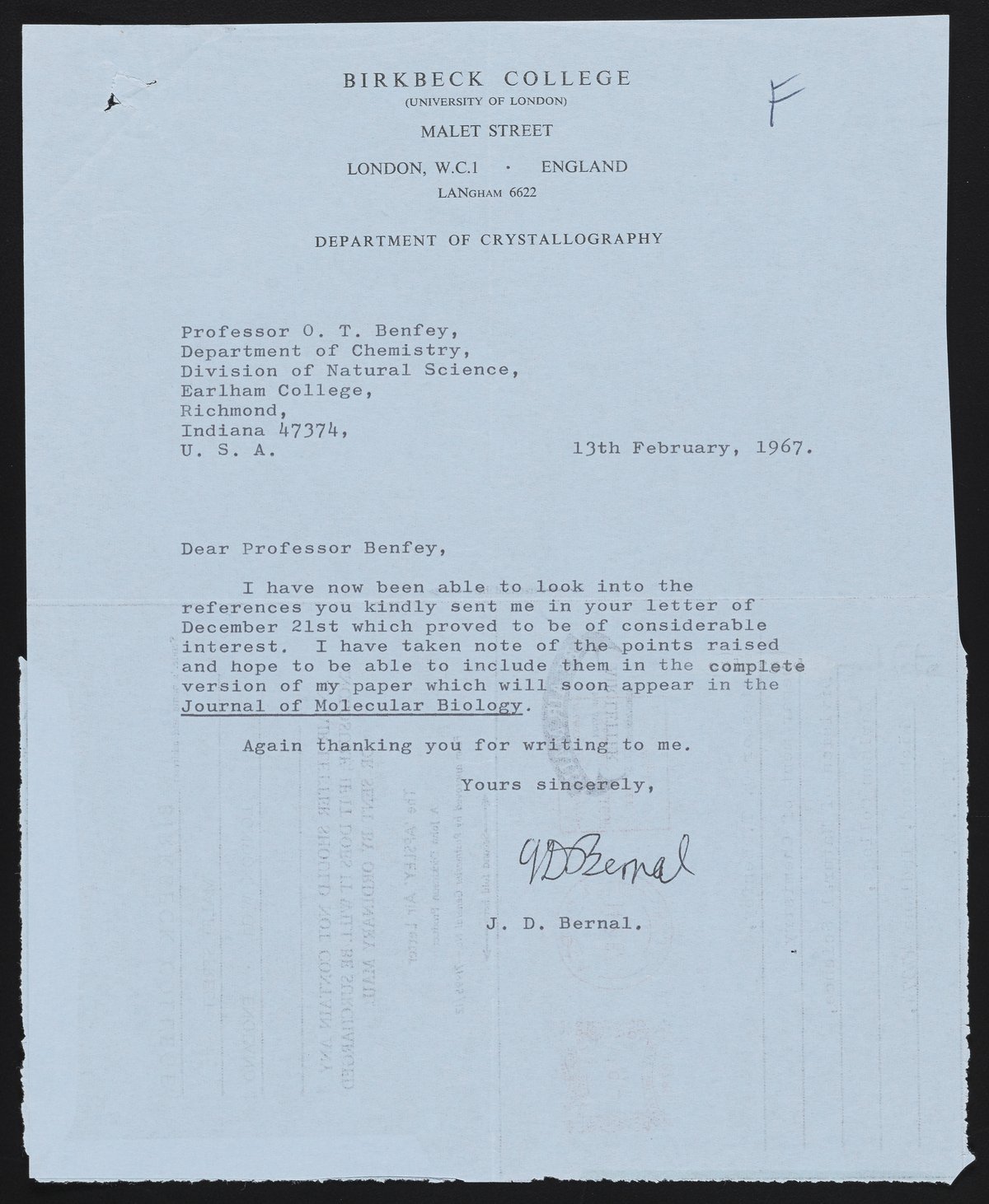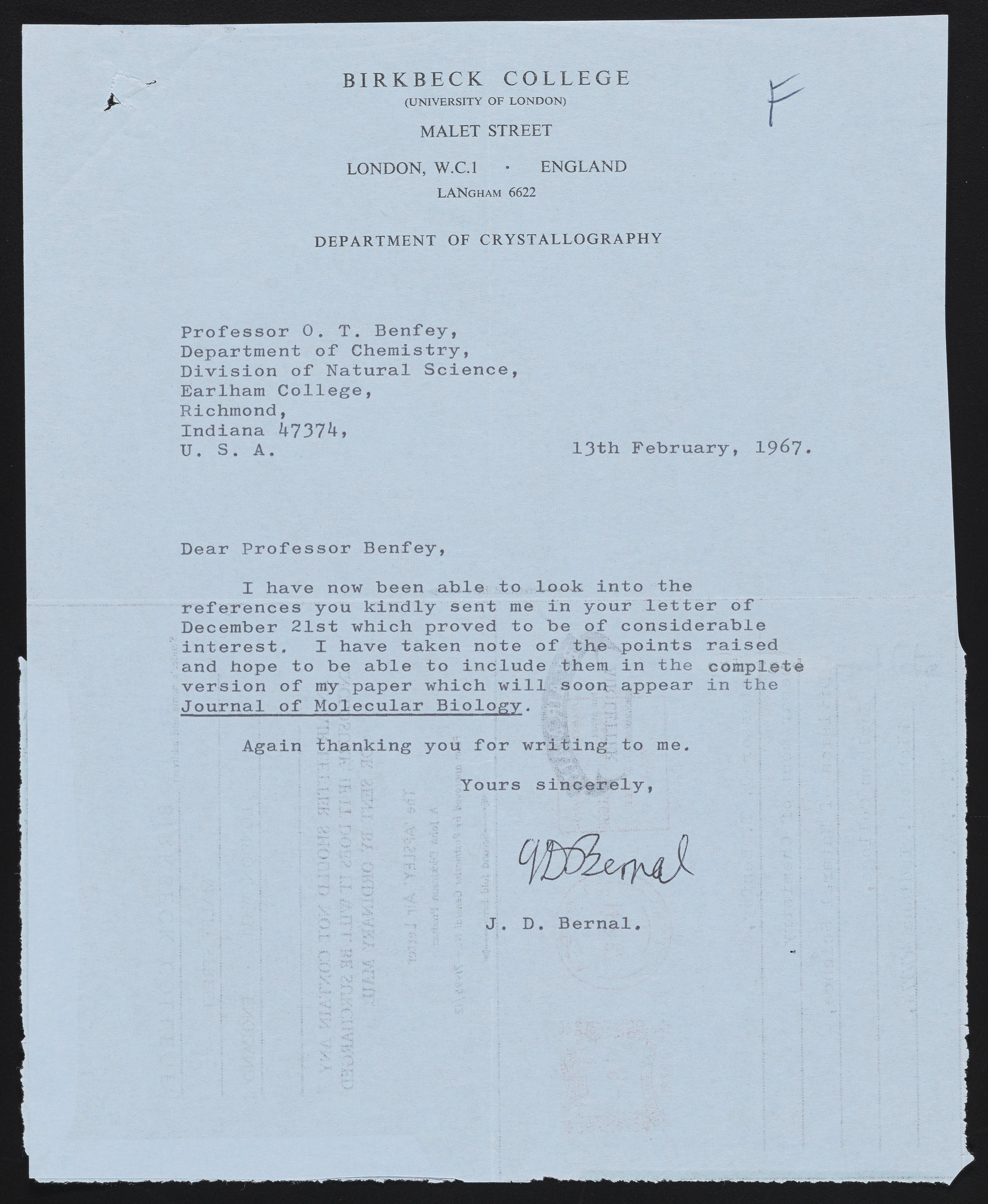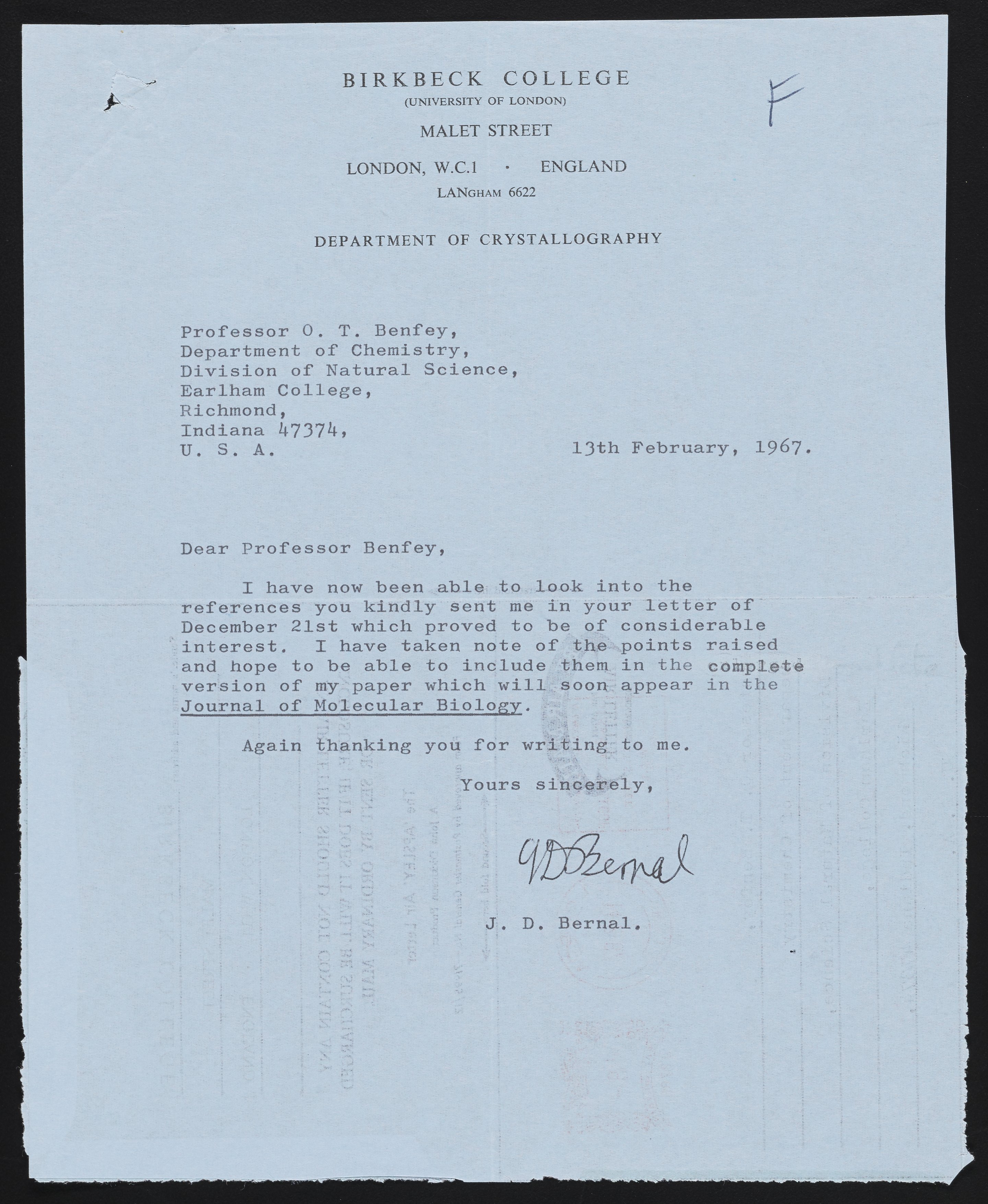Bernal, J. D. (John Desmond). “Letter from John D. Bernal to Theodor Benfey,” February 13, 1967. Benfey Autographed Letter Collection, Box 1. Science History Institute. Philadelphia. https://digital.sciencehistory.org/works/3n203z15j.