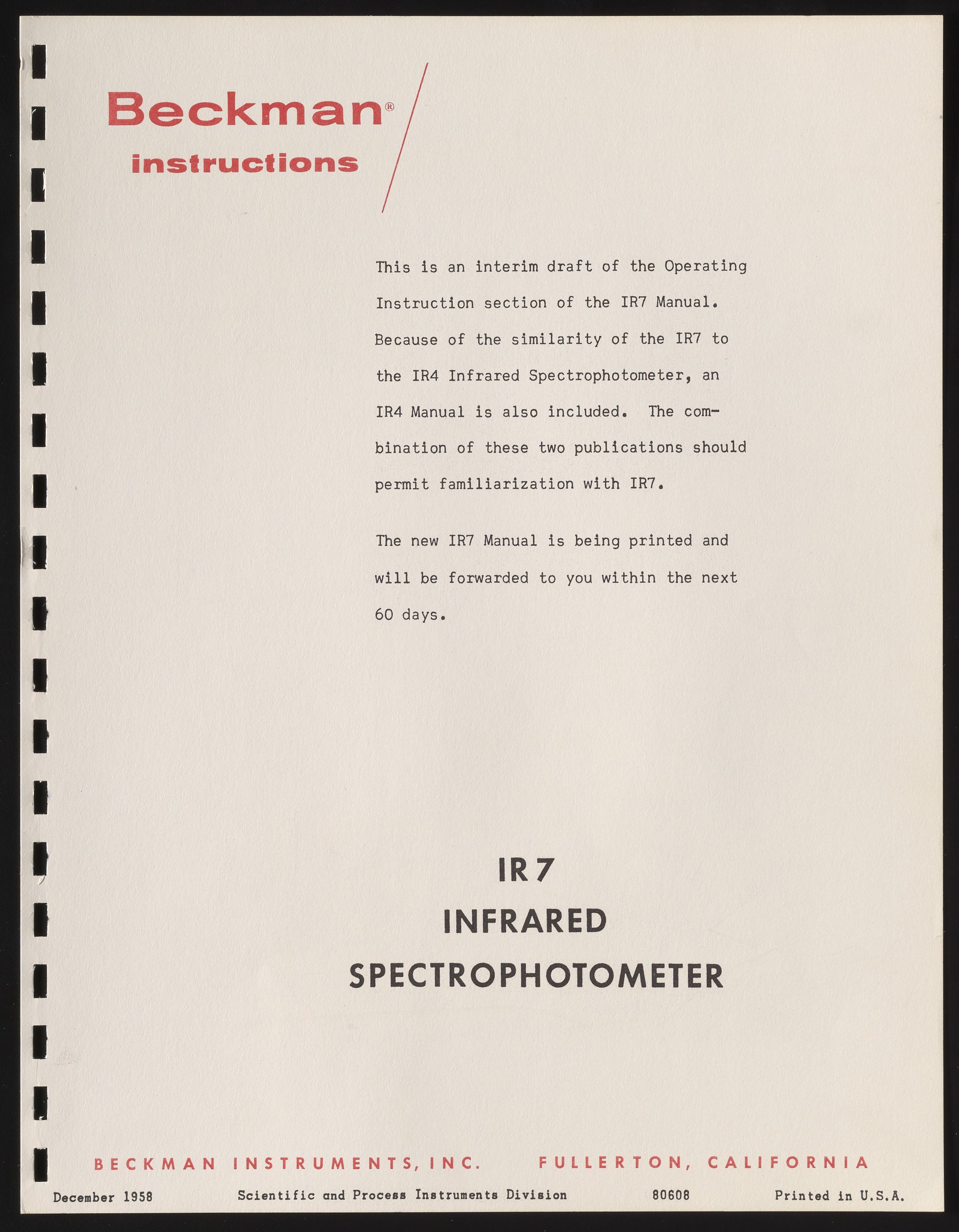 Beckman IR7 Infrared Spectrophotometer Instruction Manual
