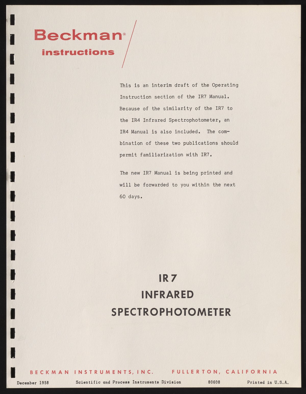 Beckman Instruments, Inc. “Beckman IR7 Infrared Spectrophotometer Instruction Manual,” December 1958. Beckman Historical Collection, Box 106, Folder 38. Science History Institute. Philadelphia. https://digital.sciencehistory.org/works/3n203z173.