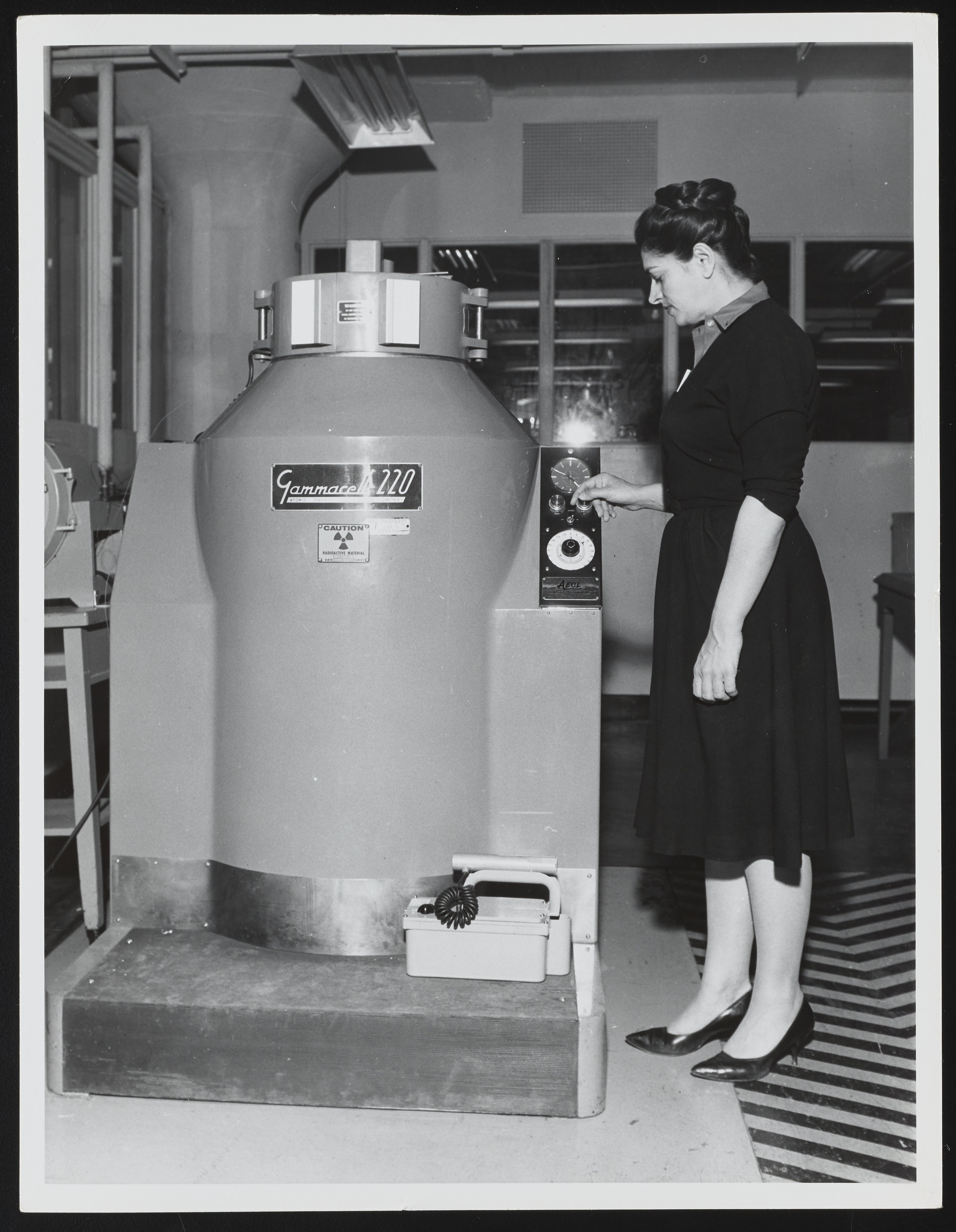Eleanor Vadala, chemist, demonstrating use of the Gammacell 220, a textile chemistry machine, at the Naval Air Material Center's Aerospace Materials Laboratory. The Gammacell 220 is a source of Cobalt-60 gamma radiation, which is commonly used to alter the physical properties of textile fibers and polymers.