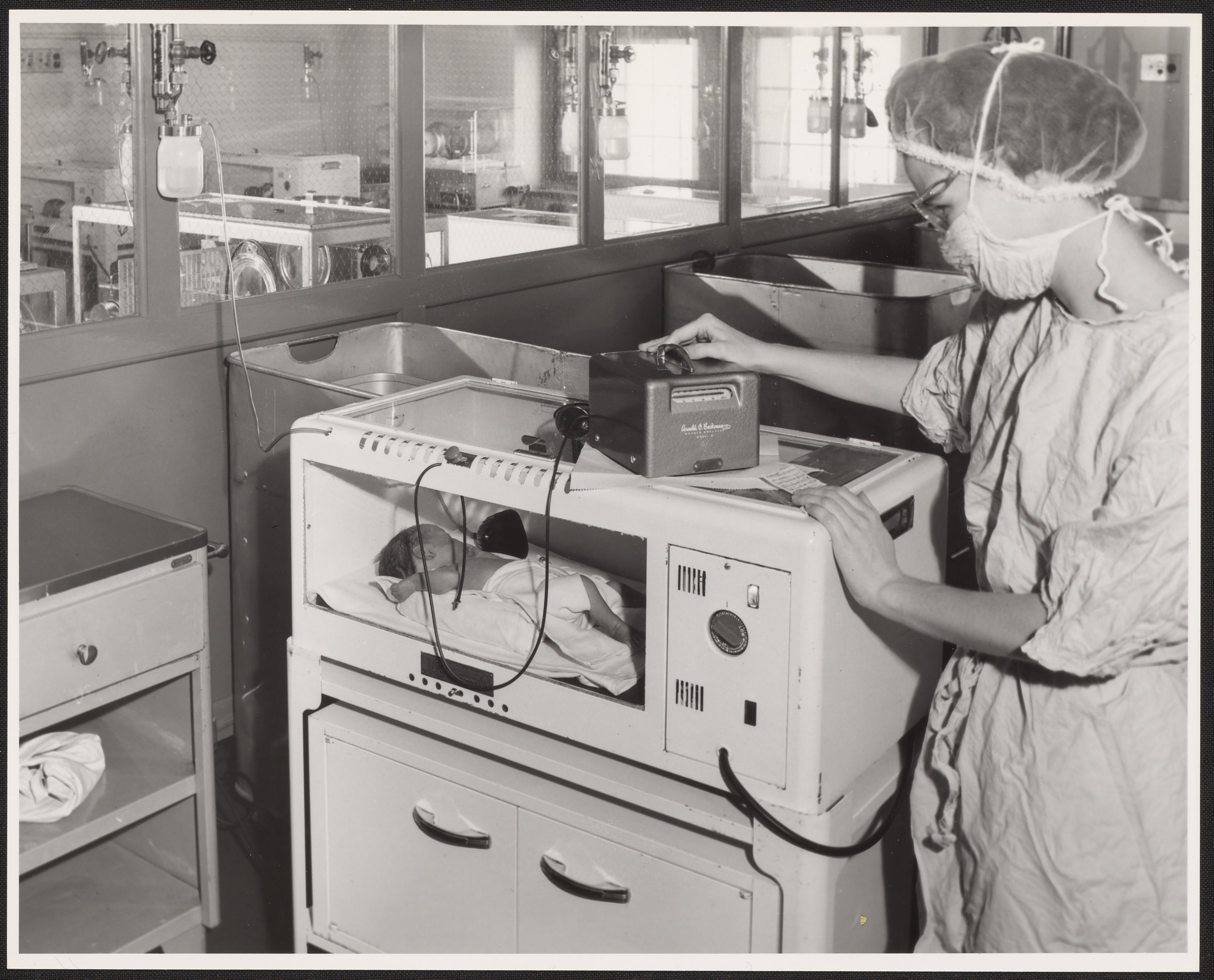Beckman Model D Oxygen Meter in use with an infant's incubator