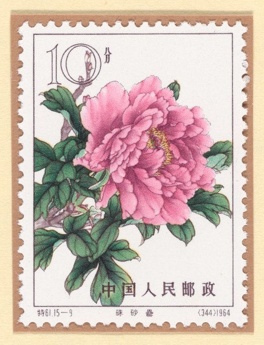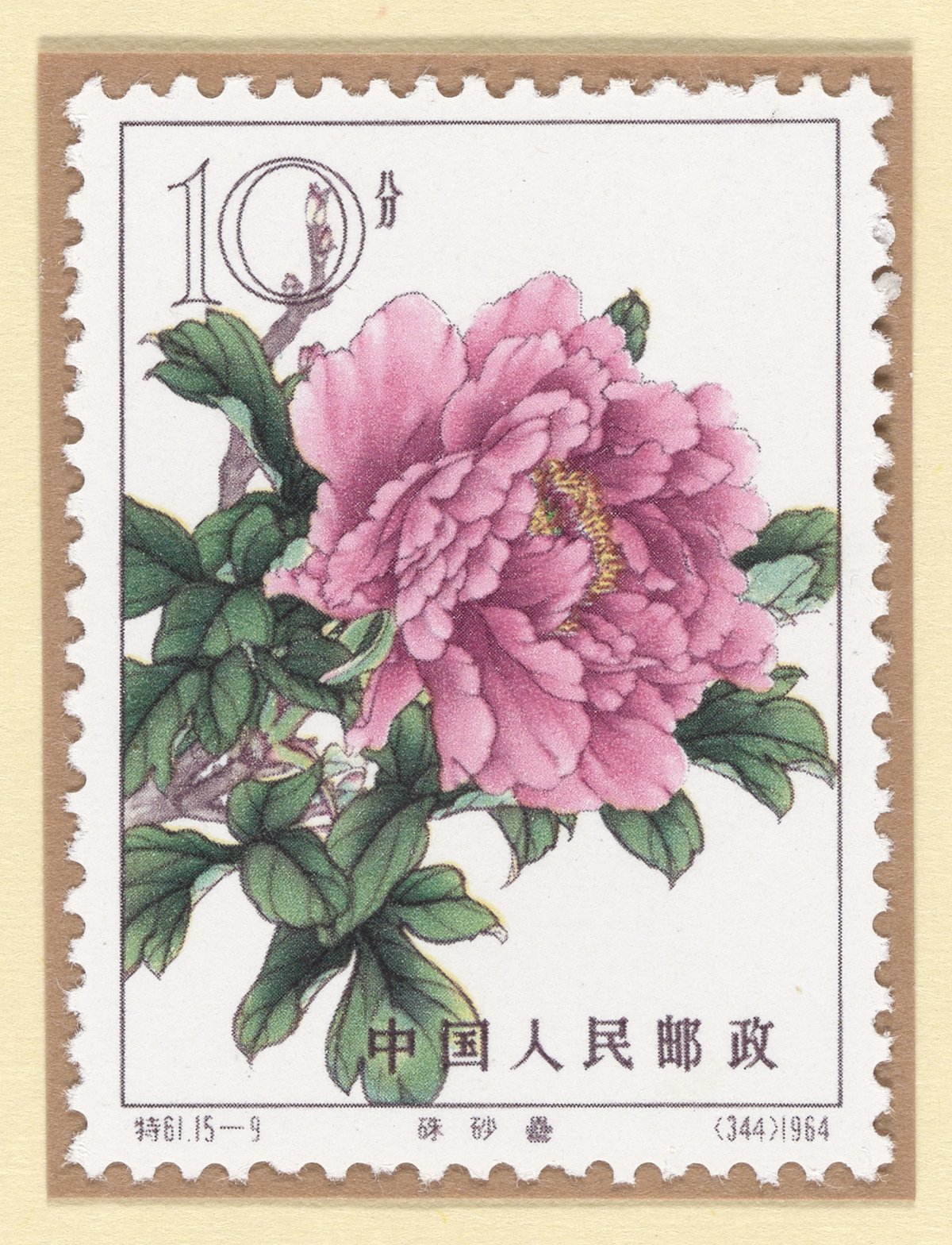 Postage stamp featuring an illustration of a variety of tree peonies called Cinnabar Ramparts (硃砂壘). This stamp is part of a stamp series titled "Tree Peonies," which was issued in 1964 by the People's Republic of China.