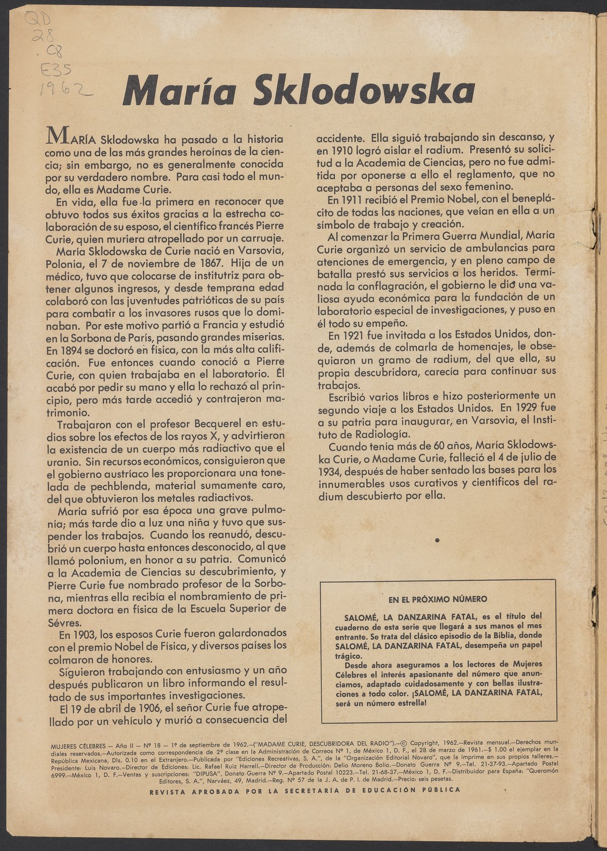 “Madame Curie, Descubridora Del Radio.” Mexico City, Mexico: Organización Editorial Novaro, September 10, 1962. QD28.C8 E35 1962. Science History Institute. Philadelphia. https://digital.sciencehistory.org/works/3nz58ef.