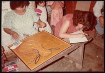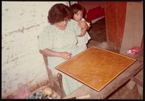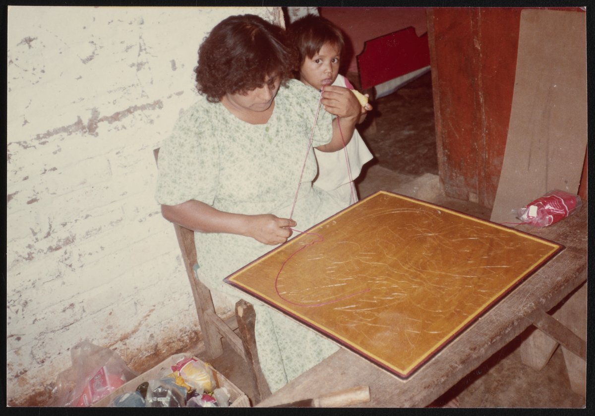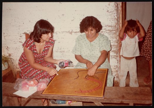 Small JPG1200 x 840px — 166 KBLarge JPG2880 x 2016px — 698 KBFull-sized JPG3240 x 2268px — 846 KBOriginal fileTIFF — 3240 x 2268px — 21.0 MBThree photographs of Huichol artist Emeteria Rios Martinez (Kapuri) (d. 1994) creating a yarn painting. Some images include her family members and children. Yarn painting involves pressing yarn into a board coated with wax or resin. The paintings usually depict Huichol culture, mythology, and shamanistic traditions.