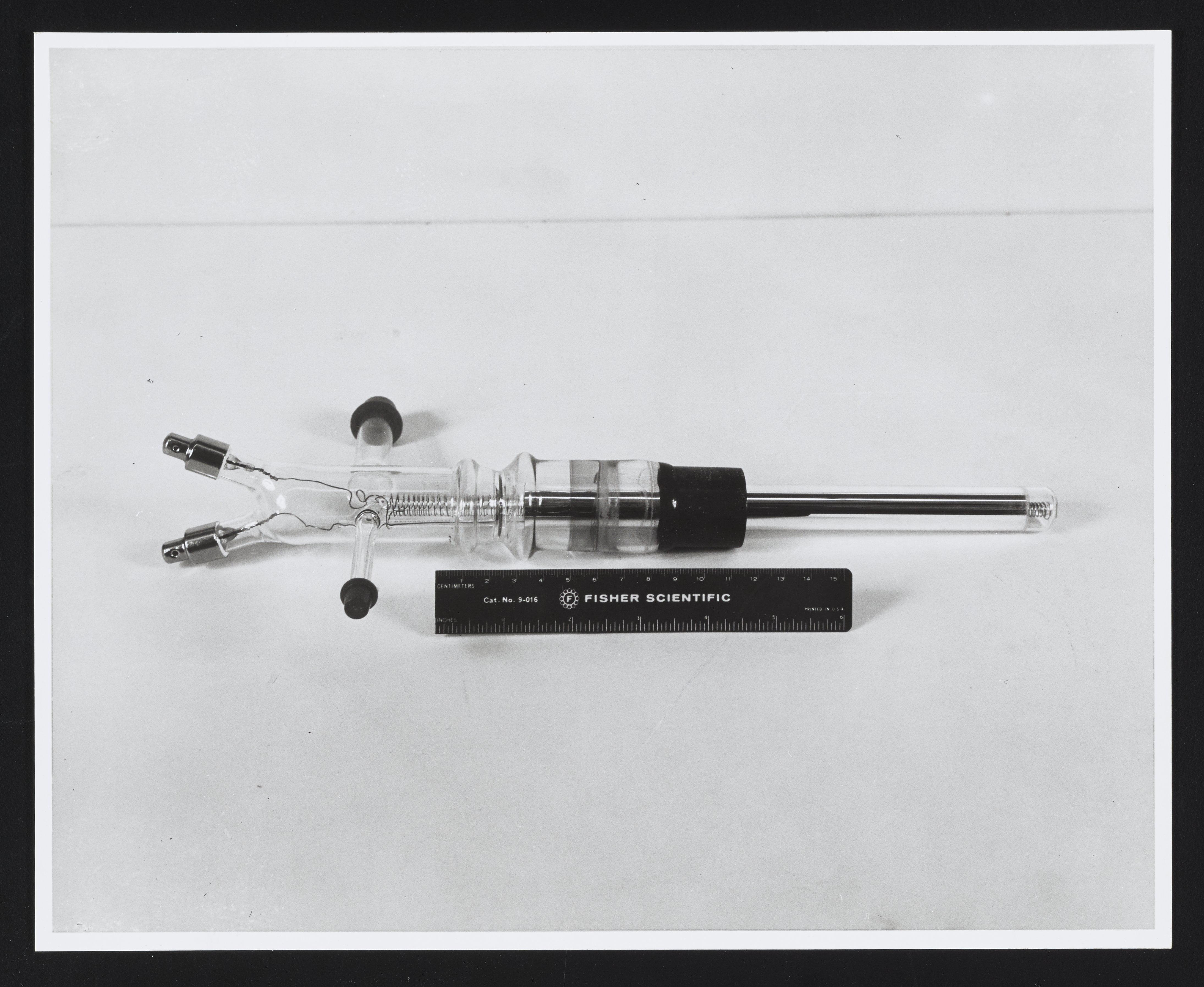 Close-up view of a component part, possibly a filament, of a Bendix Time-of-Flight Mass Spectrometer. A Fisher Scientific ruler is visible next to the component to indicate its size. The Time-of-Flight Mass Spectrometer (TOFMS) was the flagship analytical instrument of the Bendix Corporation.