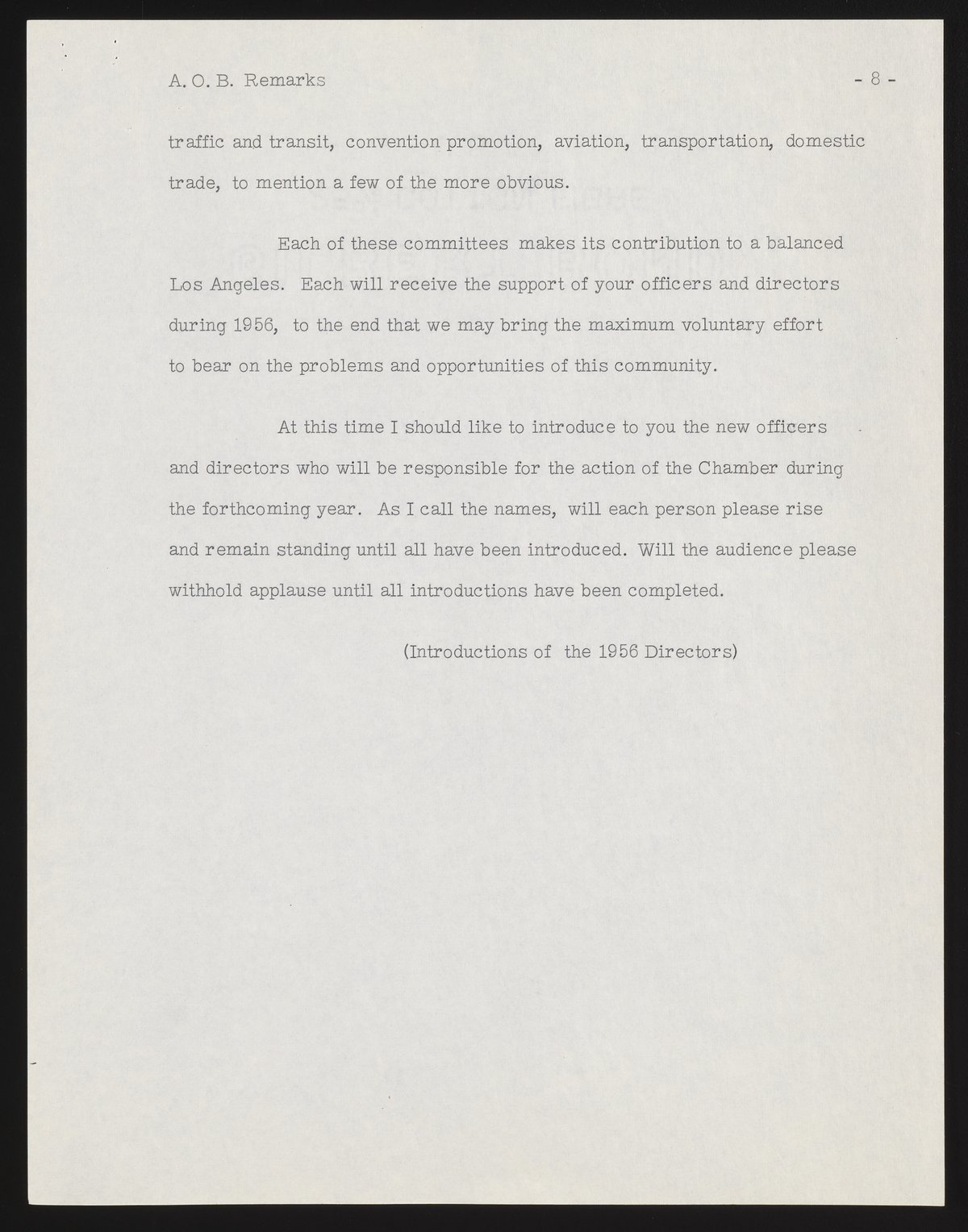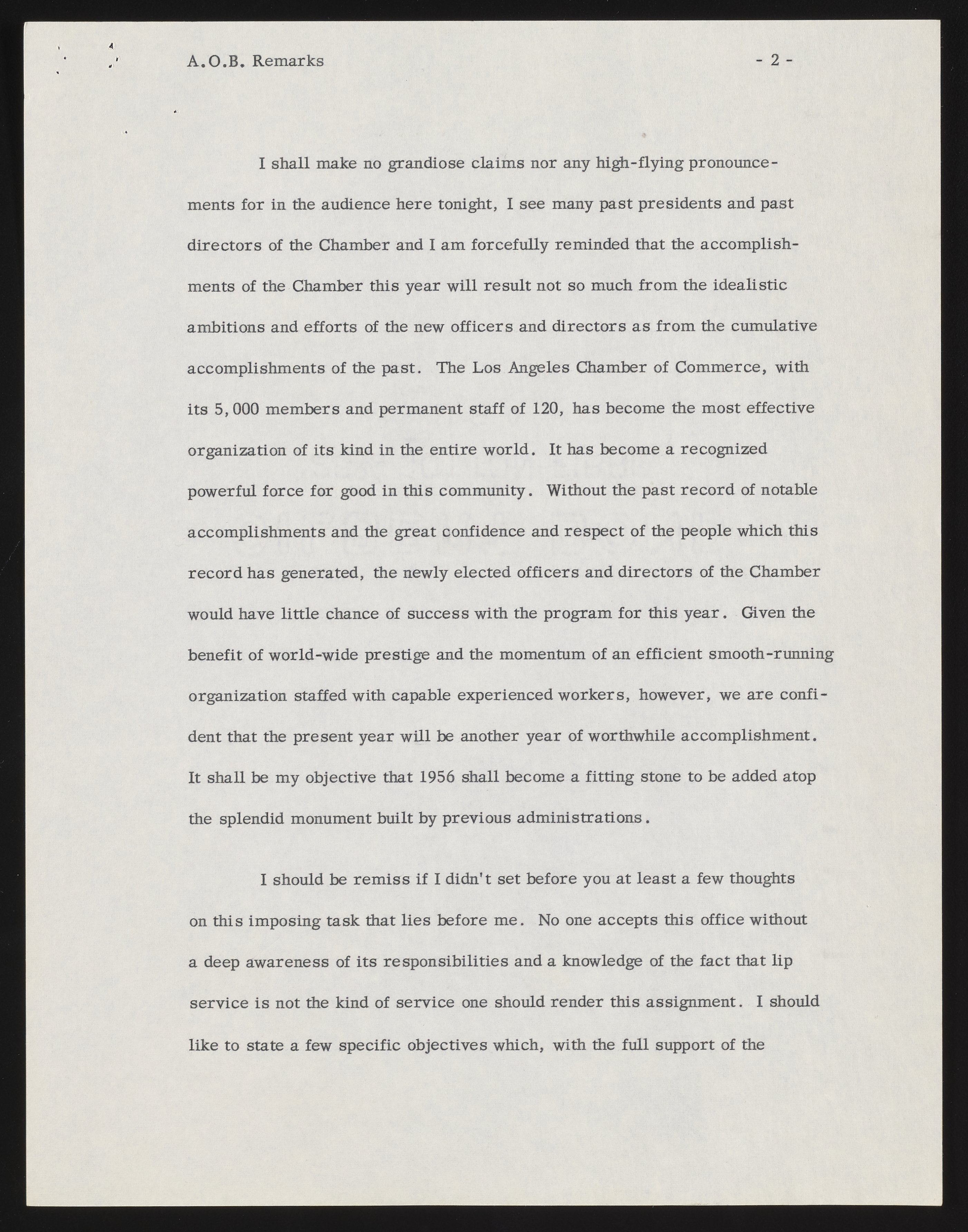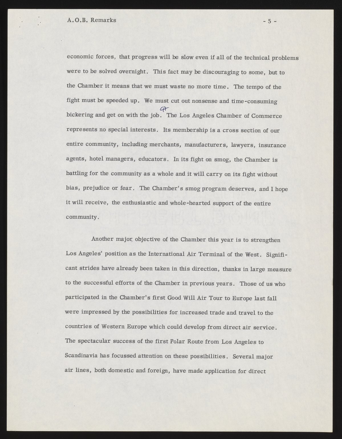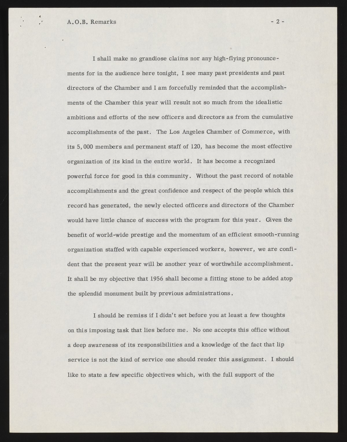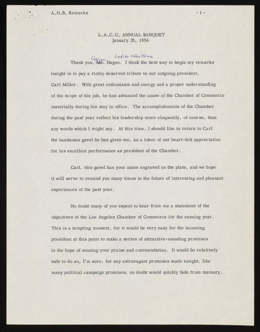 Small JPG1200 x 1537px — 231 KBFull-sized JPG2786 x 3568px — 1.0 MBOriginal fileTIFF — 2786 x 3568px — 28.5 MBBeckman's address as incoming president of the Los Angeles Chamber of Commerce references major challenges, including air pollution. A list of incoming officers and directors is included, along with minor annotations in pen.