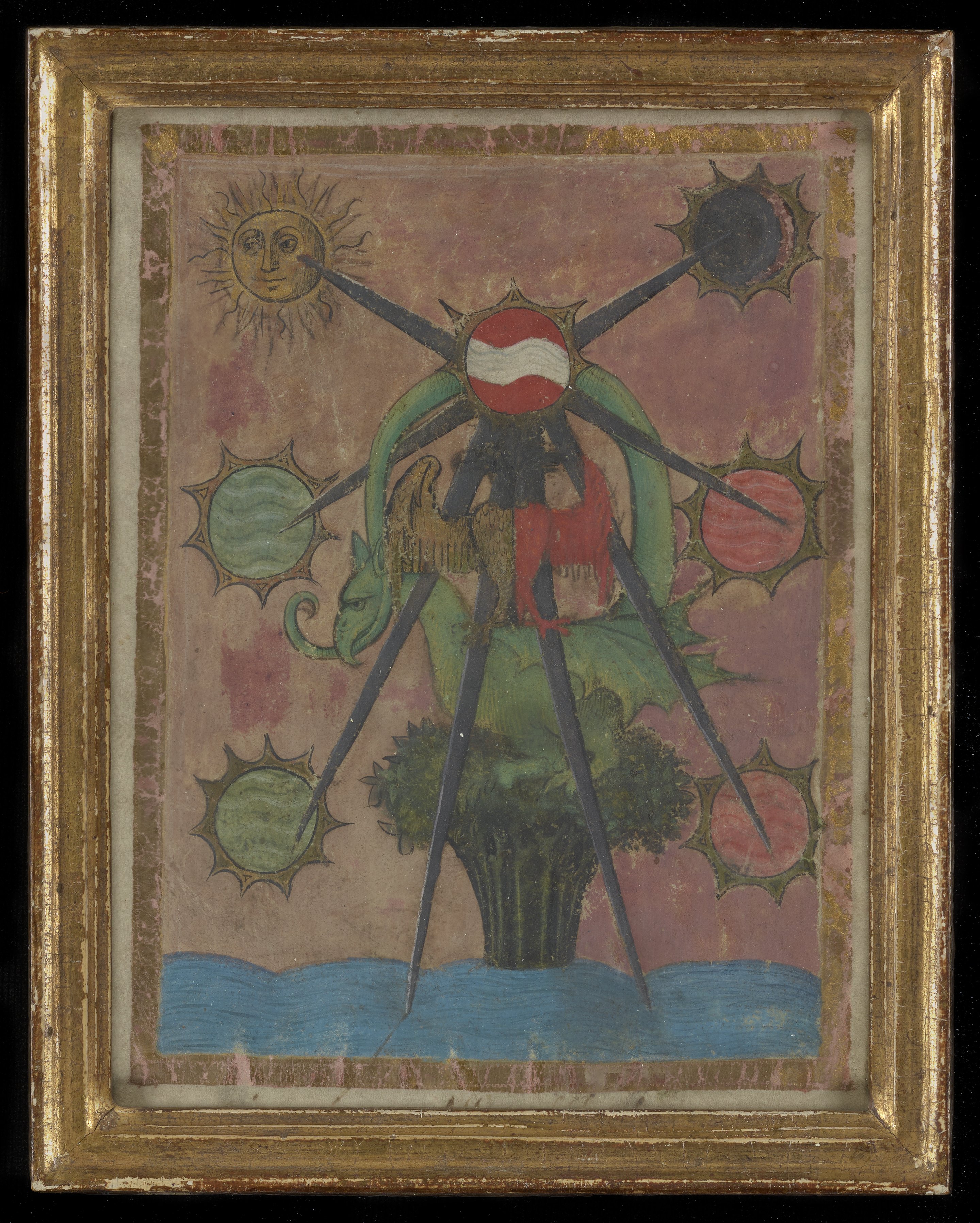 This alchemical miniature is believed to be from Das Buch der heiligen Dreifaltigkeit (The Book of the Holy Trinity), based on the iconography depicted and its relation to the text. Das Buch der heiligen Dreifaltigkeit is the first alchemical text in German produced in either Southern Germany or Austria.