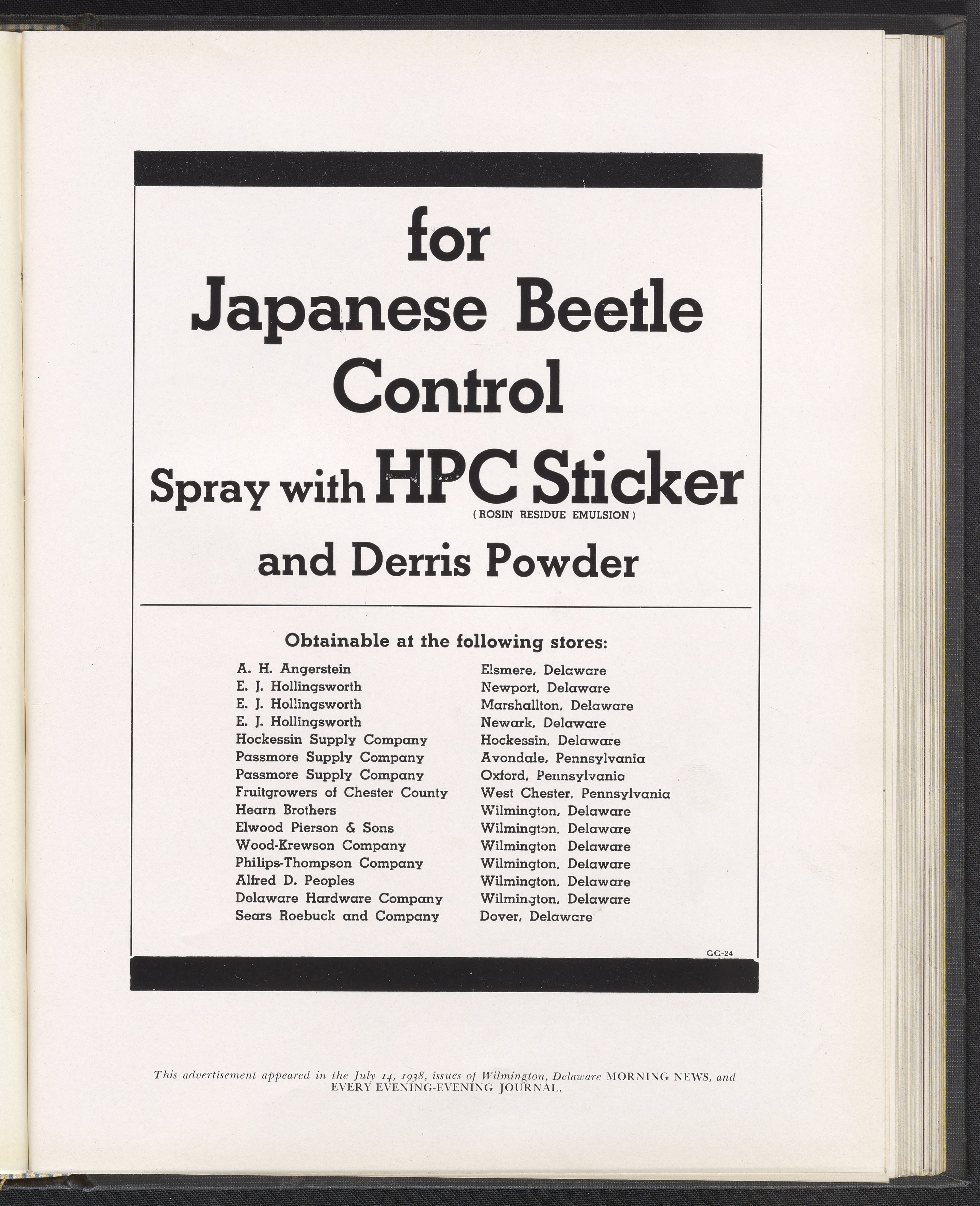 Hercules Incorporated. “For Japanese Beetle Control Spray with HPC Sticker and Derris Powder.” 1938 Hercules Advertisements, 1938. Records of Hercules Incorporated, Volume 1938. Science History Institute. Philadelphia. https://digital.sciencehistory.org/works/3t945r646.