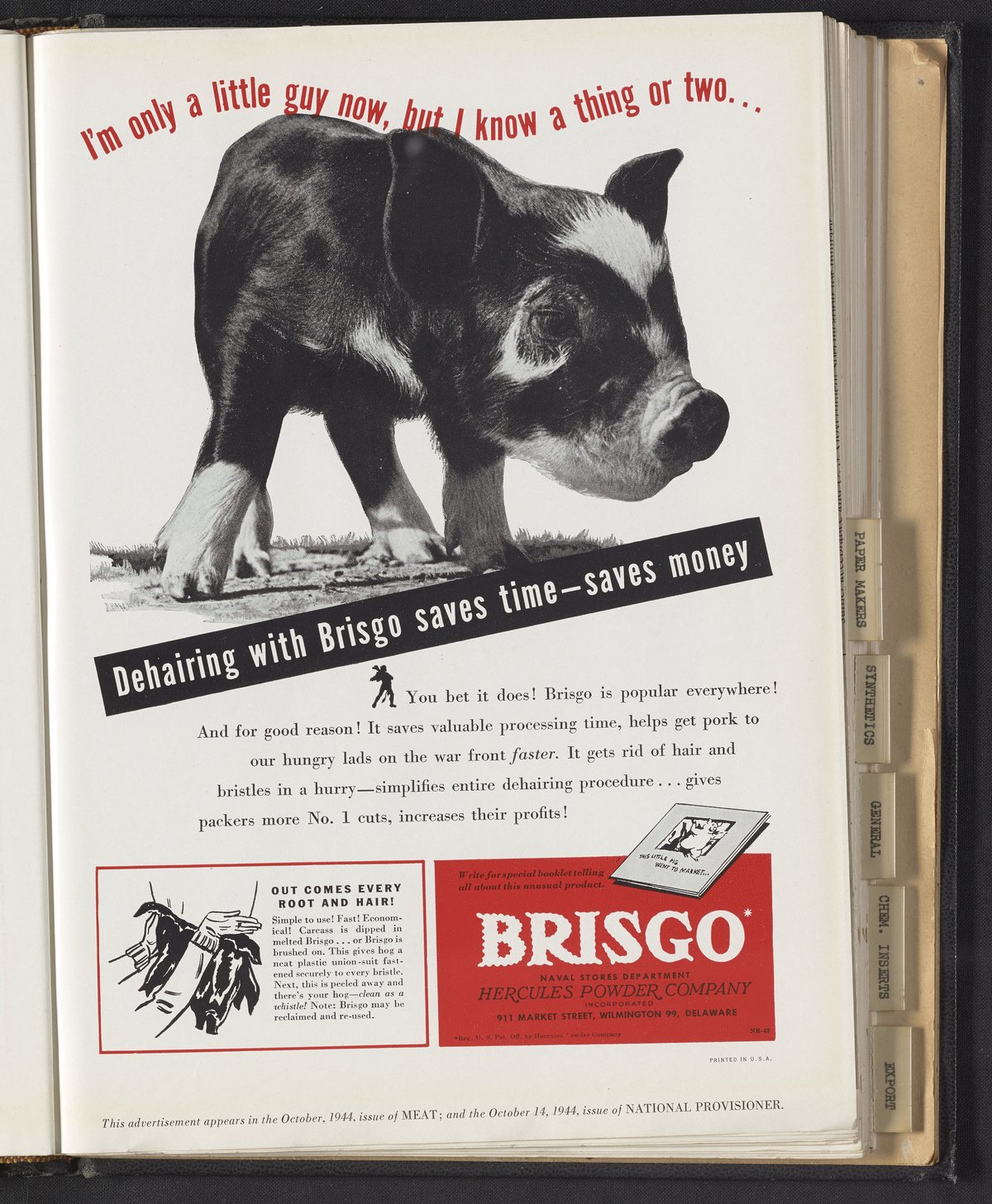 Advertisement for Brisgo, a trademarked depilatory compound manufactured and sold by the Hercules Powder Company for the cosmetic removal of hair from hog skin. Formed in 1912 as part of an anti-trust settlement with DuPont, the Hercules Powder Company (later Hercules Inc.) initially specialized in the manufacture of explosives and smokeless powders and subsequently diversified its business to encompass a variety of industrial products, including pine and paper chemicals, synthetics, pigments, polymers, and cellulose.