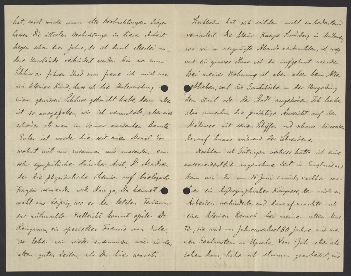 Nachdem ich Göttingen verliess hatte ich eine ausserordentlich angenehme Zeit in England, und kam von da am 15 Juni zurück; nachher war hier ein hydrographischer Kongress, der mich an Arbeiten verhinderte und darauf machte ich einen kleinen Besuch bei meiner alten Mutter, sie wird am Jahreswechsel 80 Jahre, und meinen Geschwistern in Upsala. Vom 1 Juli aber, als Cohen kam, habe ich stramm gearbeitet, und
