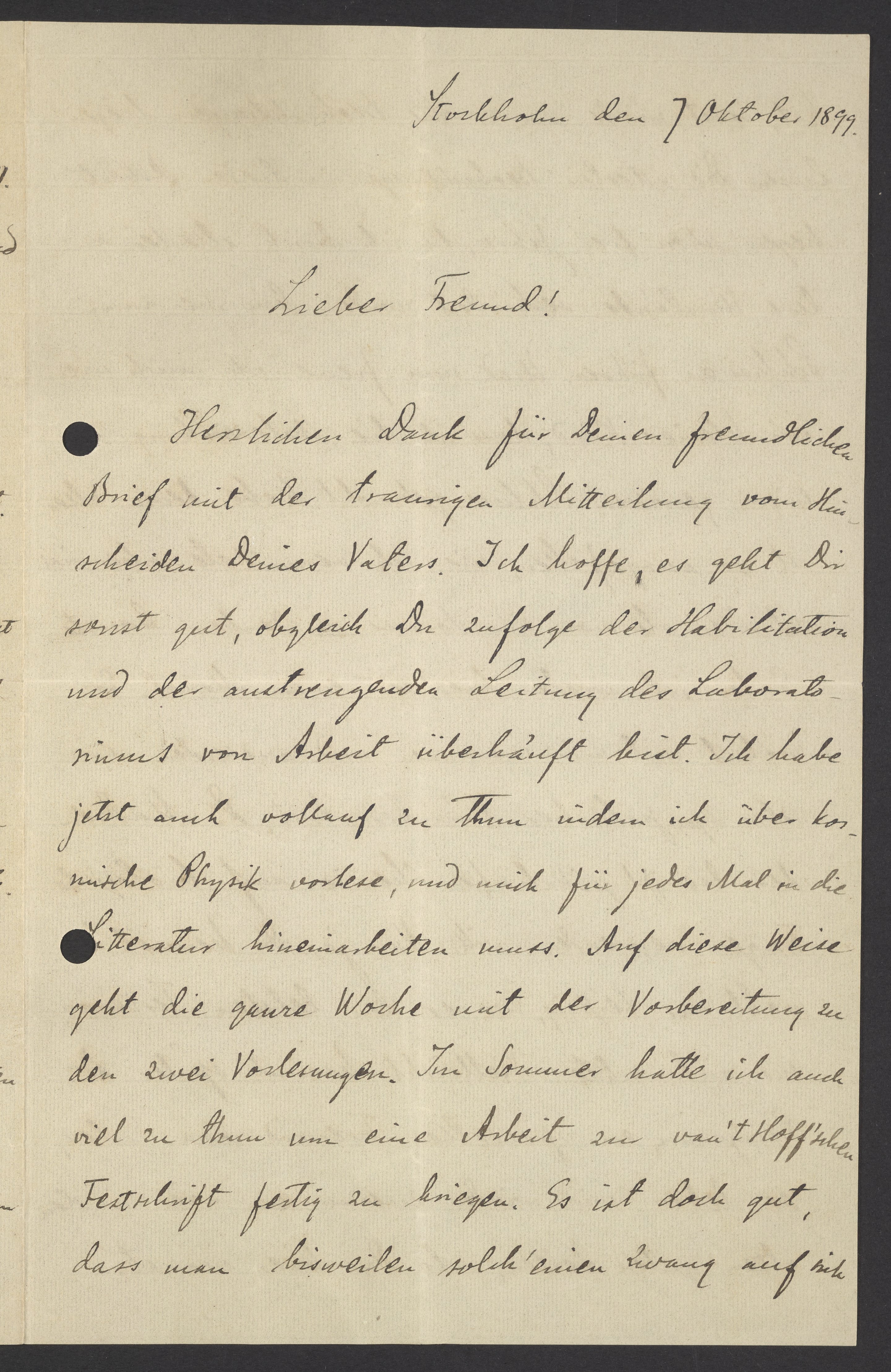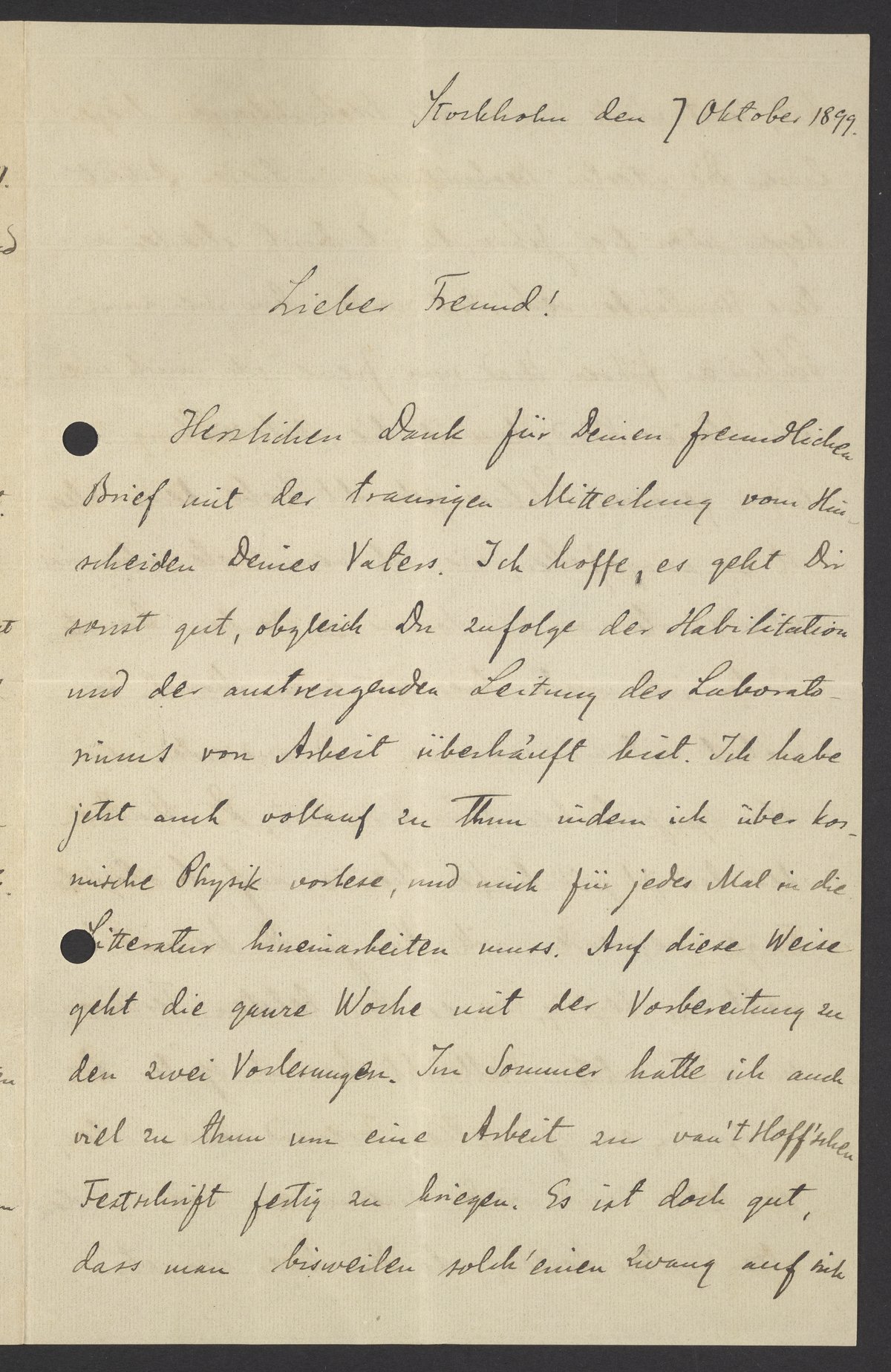 Thank you very much for your kind letter with the sad news of your father's passing. I hope you are doing well otherwise, even though you are overwhelmed with work because of your habilitation and the strenuous management of the laboratory. I am now also very busy reading about cosmic physics and must familiarize myself with the relevant literature each time. Hence, my whole week is spent preparing for two lectures. Over the summer, I also had a lot to do to finish a paper for van't Hoff's commemorative publication. It's good that I have a lot on my plate from time to time.