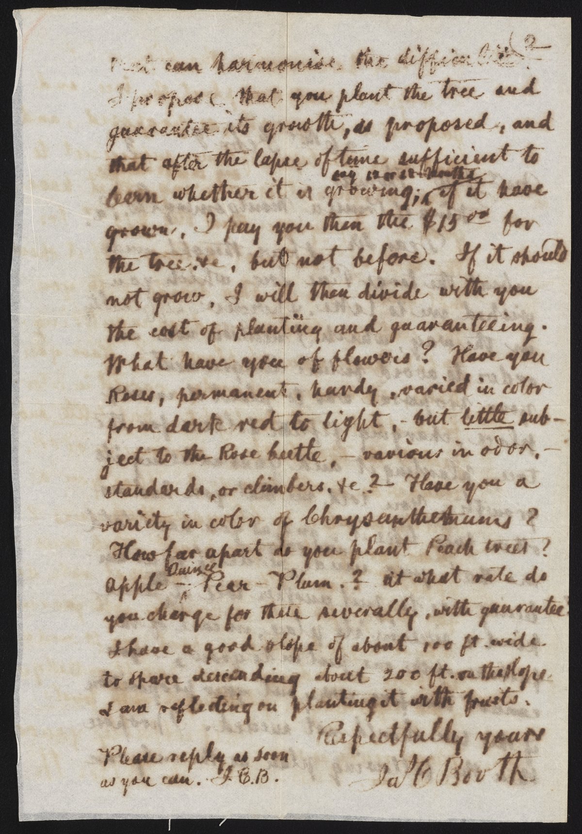 Small JPG1200 x 1718px — 393 KBLarge JPG2880 x 4123px — 1.9 MBFull-sized JPG3704 x 5302px — 3.0 MBOriginal fileTIFF — 3704 x 5302px — 56.2 MBJames Curtis Booth (1810-1888) discusses Joseph W. Thomas' proposal to sell him a large pine tree.