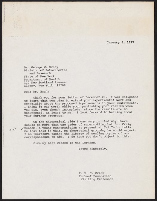 Crick, Francis. “Letter from Francis Crick to George W. Brady, January 4, 1977,” January 4, 1977. History of Molecular Biology Collection, Box 20, Folder 8. Science History Institute. Philadelphia. https://digital.sciencehistory.org/works/3zy2f5v.