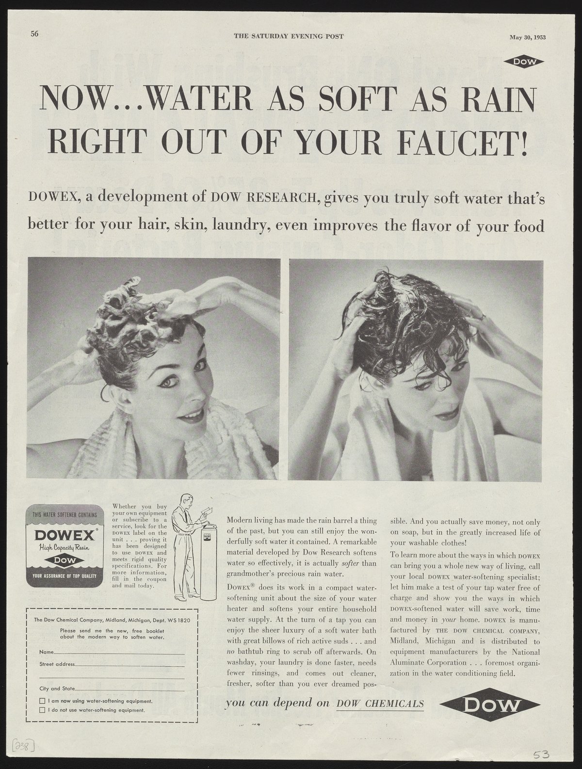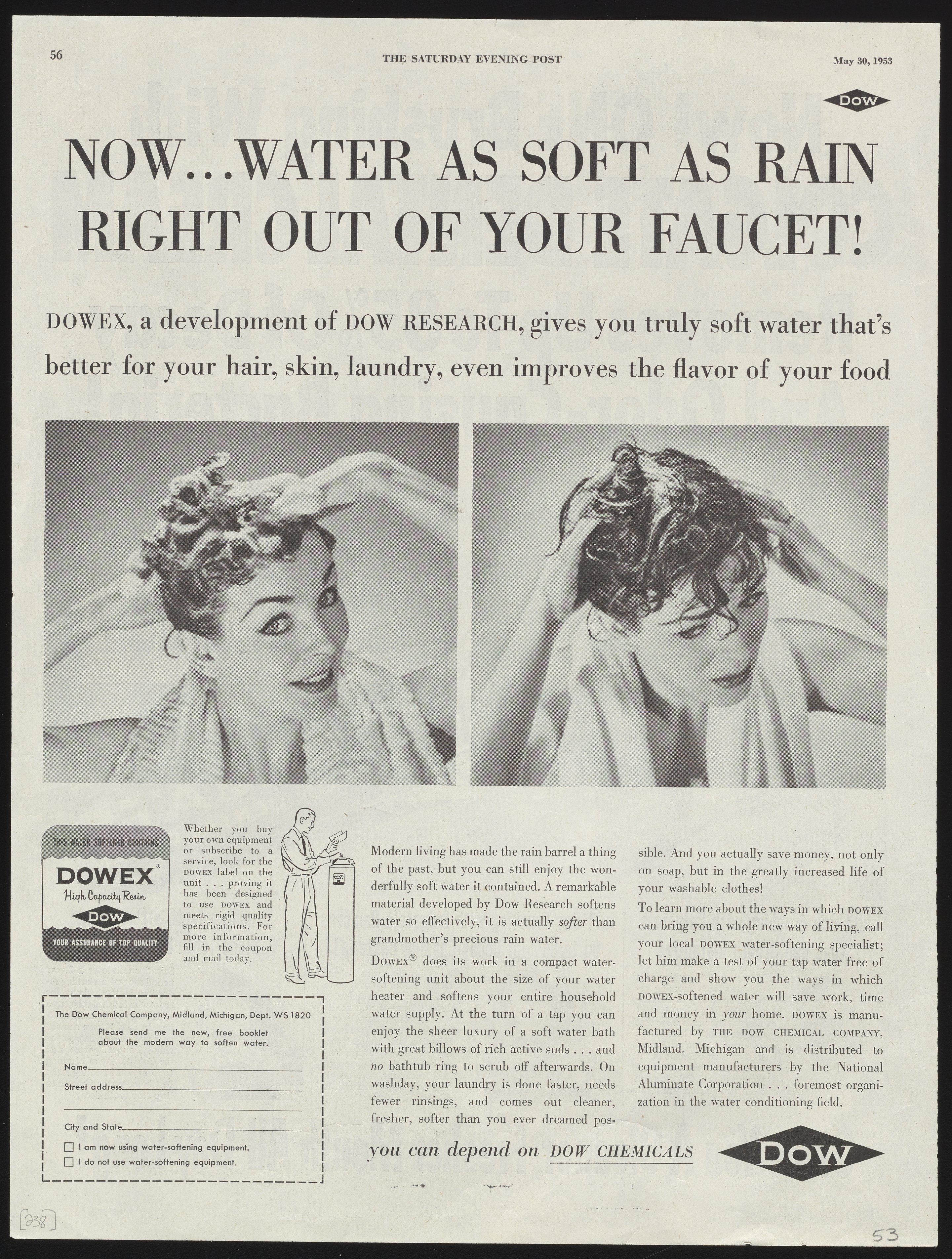 Dow Chemical Company. “Now...Water as Soft as Rain Right Out of Your Faucet!,” May 30, 1953. Advertisements from the Dow Chemical Historical Collection, Box 7. Science History Institute. Philadelphia. https://digital.sciencehistory.org/works/41687j17m.