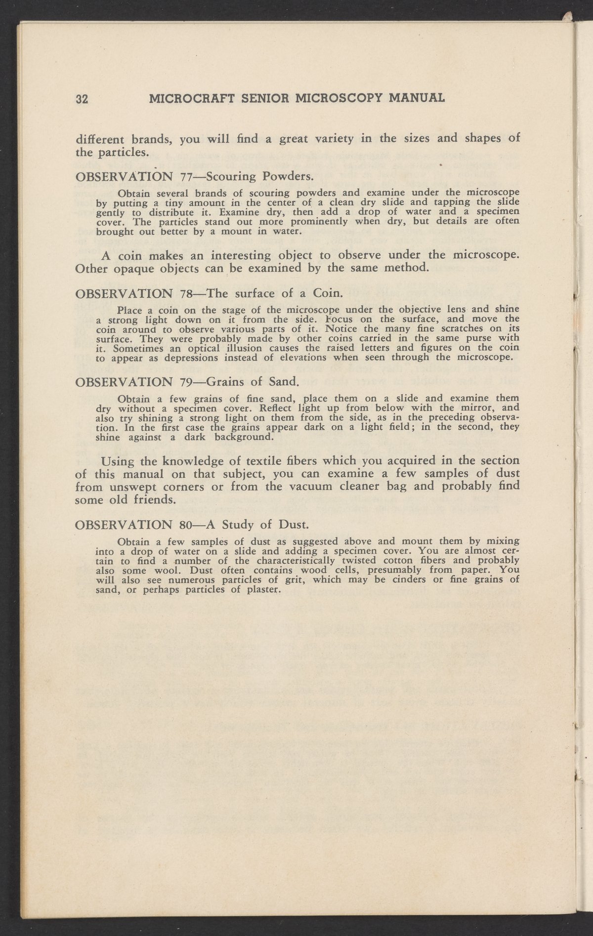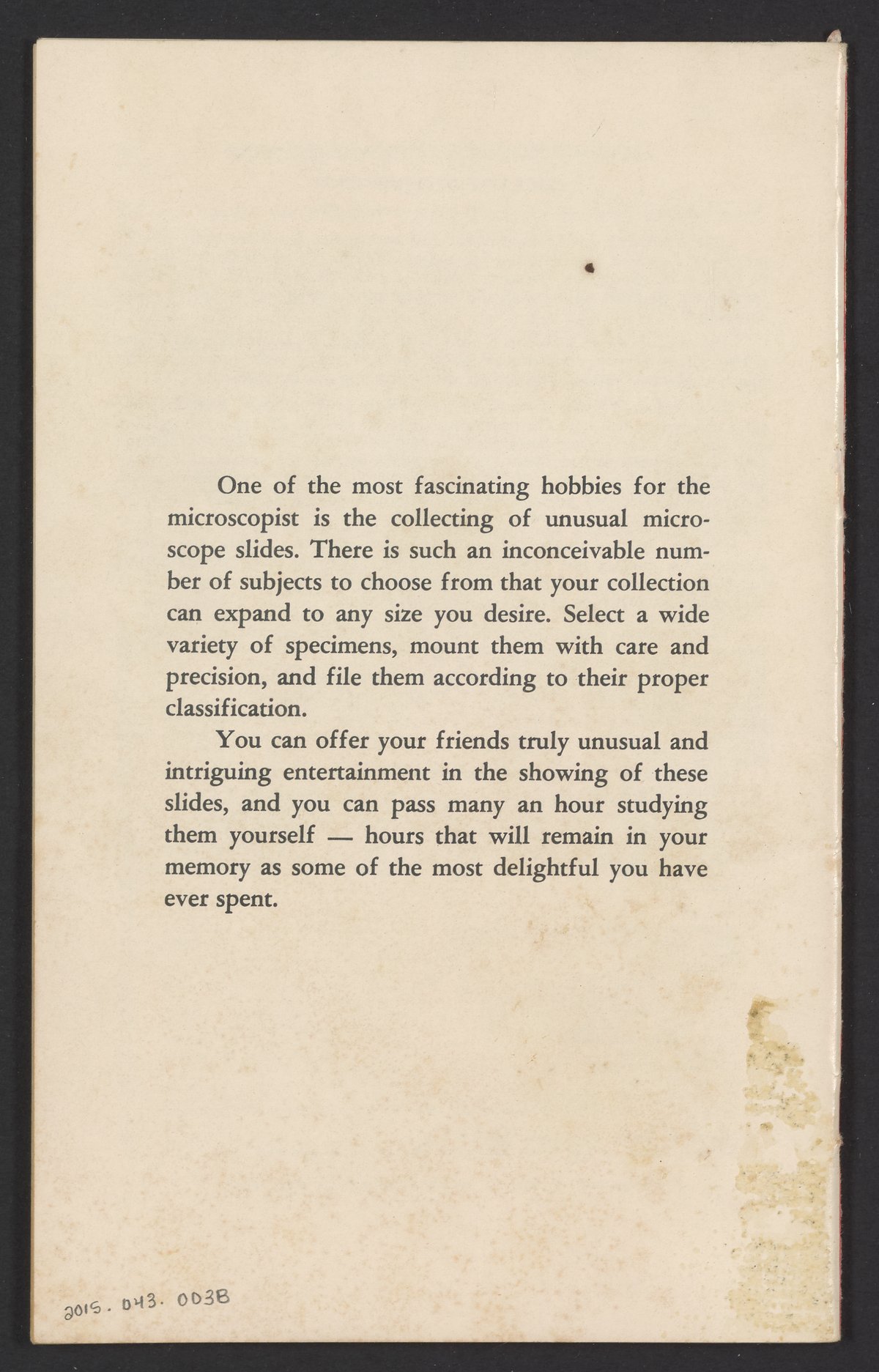 Small JPG1200 x 1866px — 359 KBFull-sized JPG2190 x 3406px — 1.1 MBOriginal fileTIFF — 2190 x 3406px — 21.4 MBManual written to accompany the Microcraft Microscope Set No. 310 for the amateur microscopist. Includes instructions for using the microscope and accessories, as well as a range of experiments and recommendations for observing biological, chemical, mineralogical, and fibrous specimens.