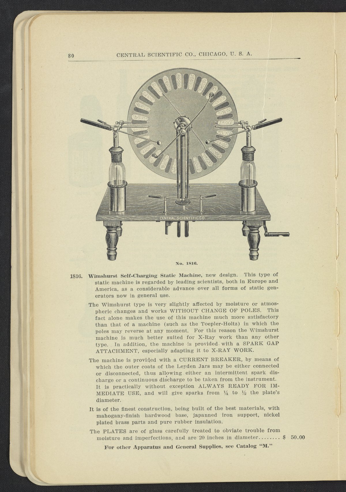 Central Scientific Company. “Wimherst Self-Charging Static Machine.” Physical Apparatus for Universities and Colleges Manufactured and Imported by Central Scientific Co. Chicago, Illinois: Central Scientific Company, 1912. Q185.7 .C46 1912. Science History Institute. Philadelphia. https://digital.sciencehistory.org/works/431kul8.