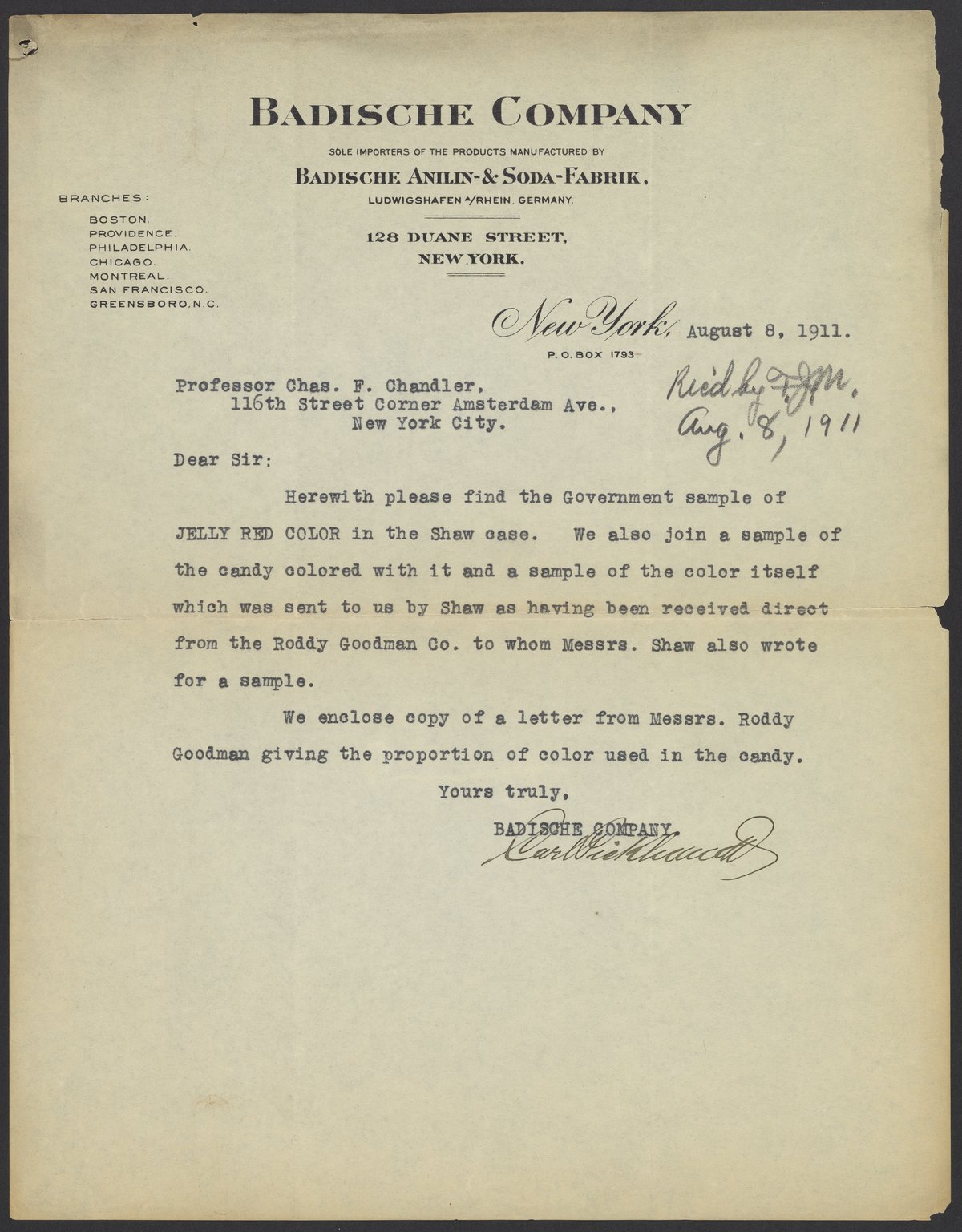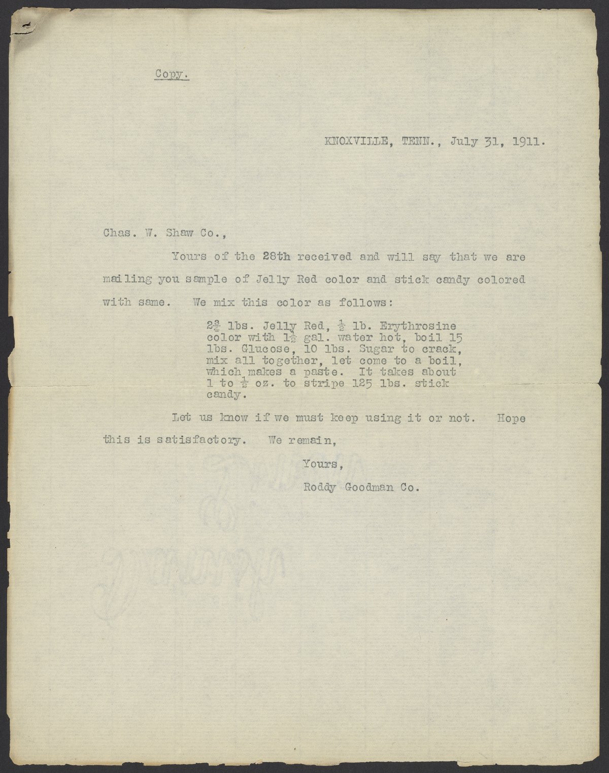 A representative from the Badische Company sends Charles F. Chandler (1836-1925) a sample of "Jelly Red" dye and a sample of candy colored with it. They have enclosed a copy of a letter from Coca-Cola bottlers and candy manufacturers, the Roddy Goodman Company. This letter contains the candy recipe.