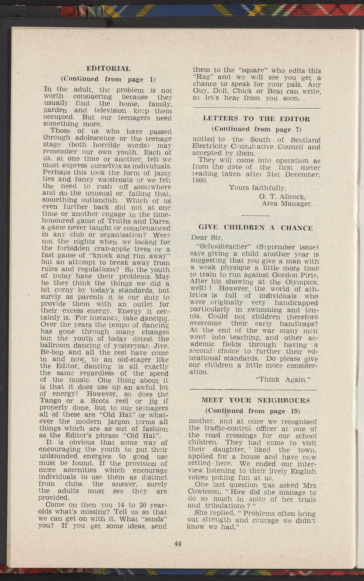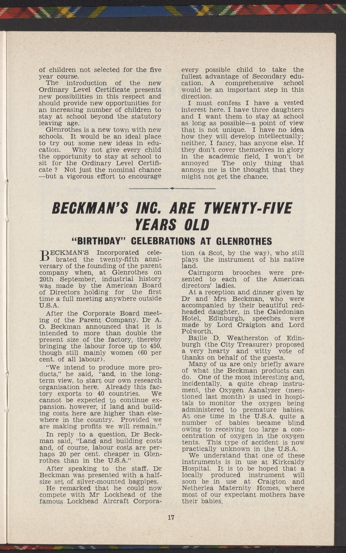 Small JPG1200 x 890px — 157 KBLarge JPG2880 x 2137px — 1.0 MBFull-sized JPG3844 x 2852px — 1.8 MBOriginal fileTIFF — 3844 x 2852px — 31.4 MBThe Glenrothes Bulletin Vol. 6, No. 8, October 1960 includes community news, letters to the editor, opinion pieces, advertisements, and, on page 17, an article about Beckman Instruments, Inc.'s 25th anniversary.