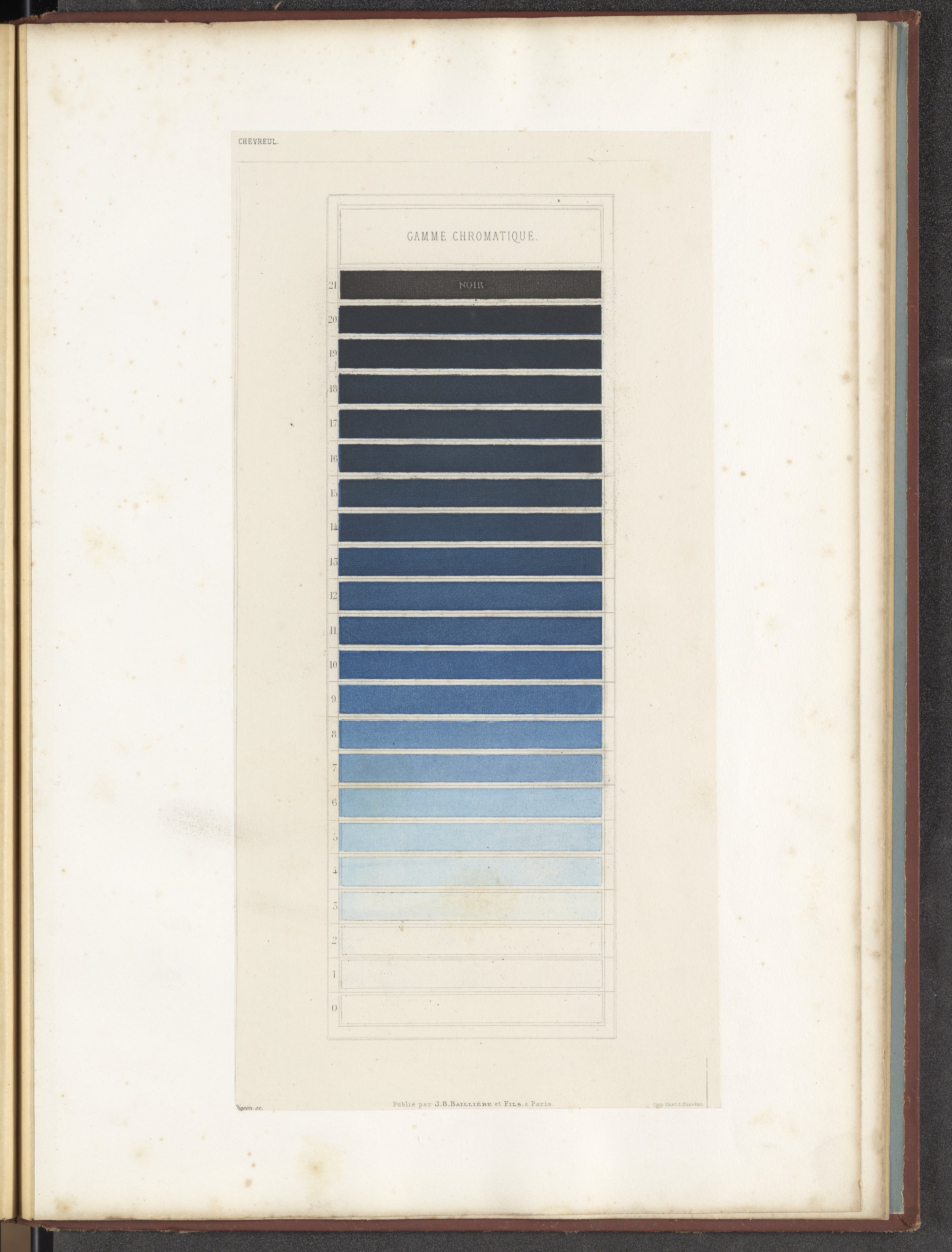 Chevreul, M. E. (Michel Eugène). “Plate XXIV: Gamme Chromatique: Bleu.” In Des Couleurs Et De Leurs Applications Aux Arts Industriels à l'Aide Des Cercles Chromatiques. Paris, France: J.-B. Baillière et fils, 1864. https://digital.sciencehistory.org/works/44558d50p.