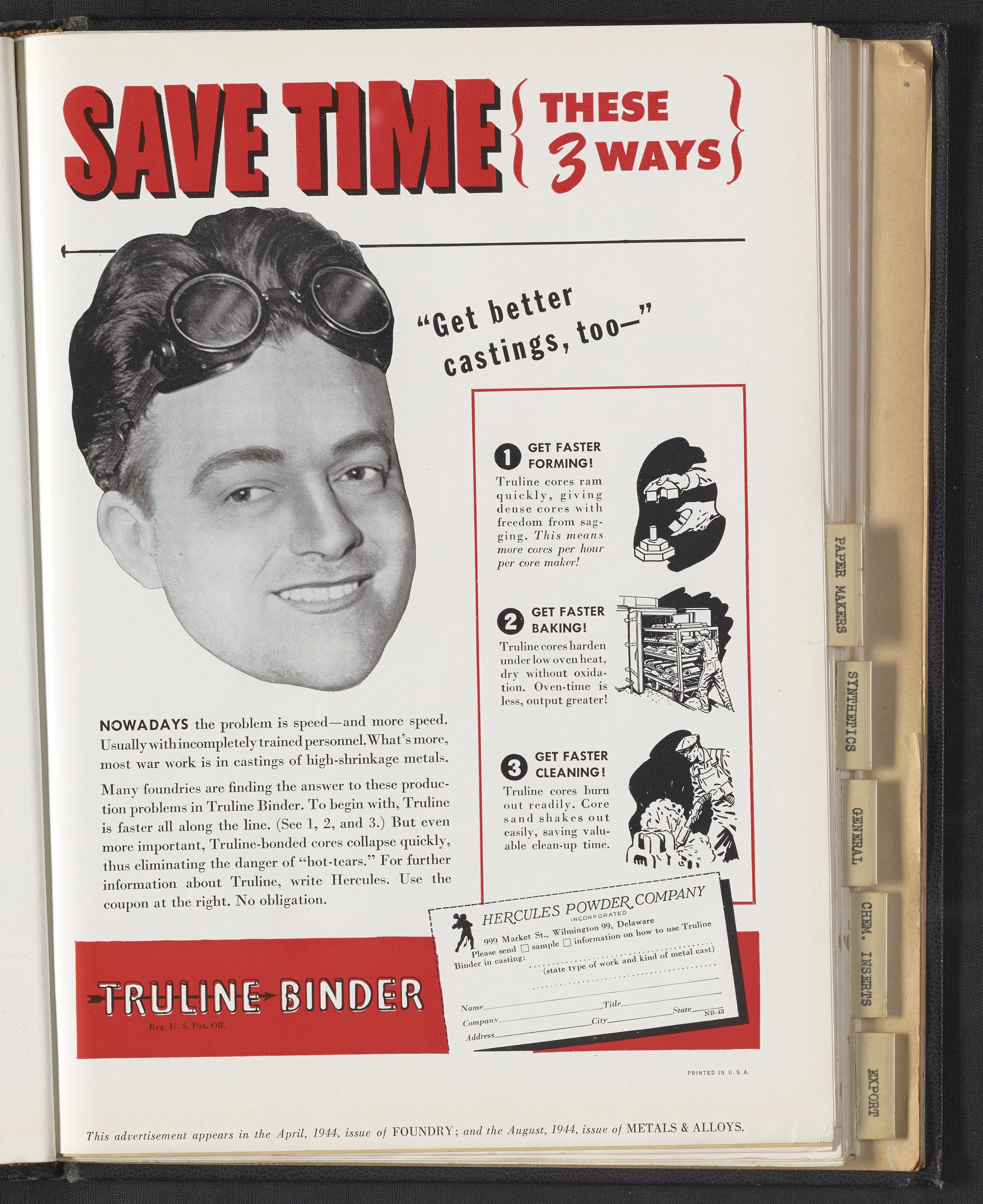 Hercules Incorporated. “Advertisement for Hercules Truline Binder.” 1944 Hercules Advertisements, 1944. Records of Hercules Incorporated, Volume 1944. Science History Institute. Philadelphia. https://digital.sciencehistory.org/works/44558f04s.