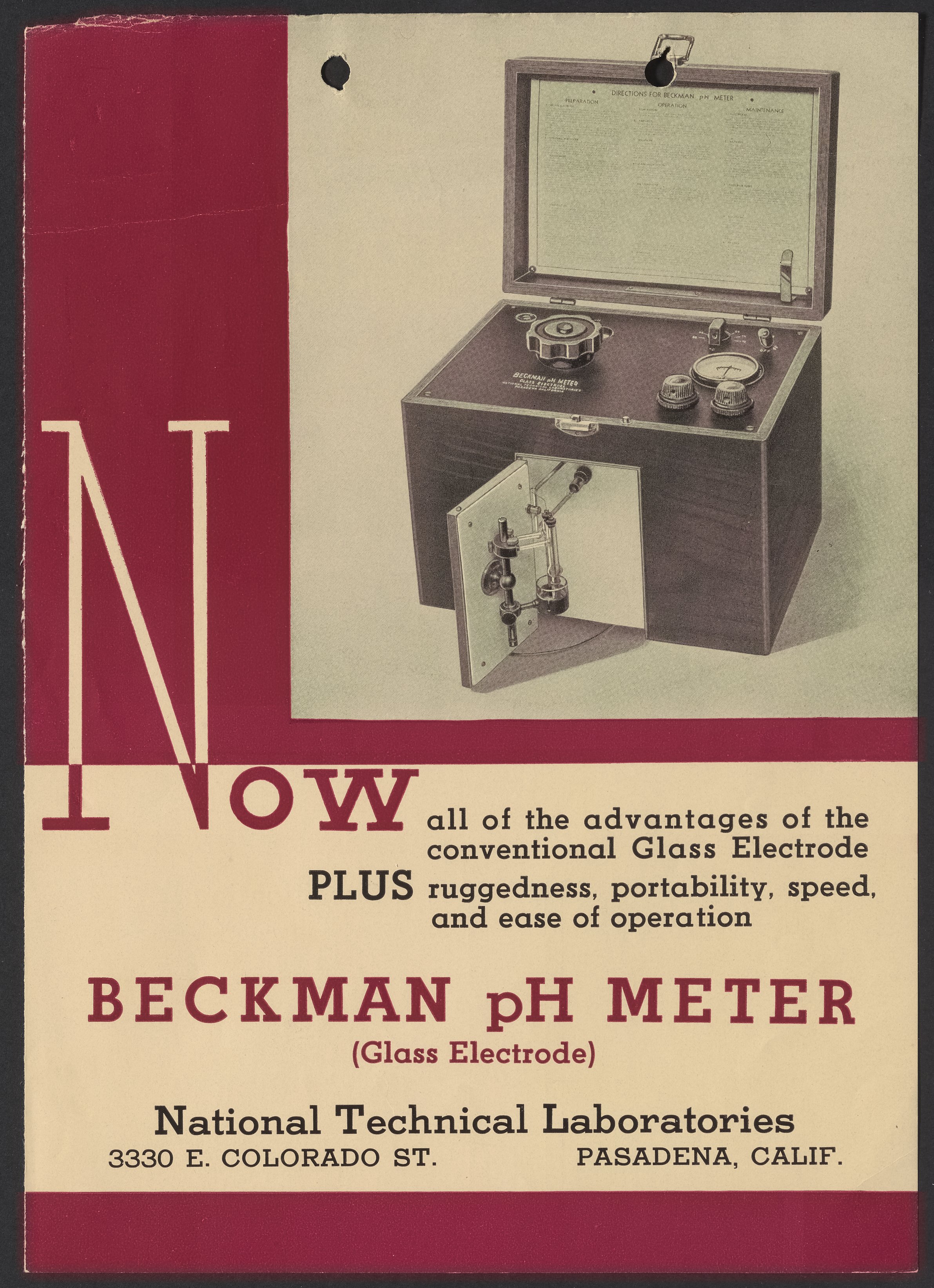 Beckman Instruments, Inc. “Beckman PH Meter (Glass Electrode) Brochure,” 1935–1940. Beckman Historical Collection, Box 20, Folder 2. Science History Institute. Philadelphia. https://digital.sciencehistory.org/works/44558f07m.