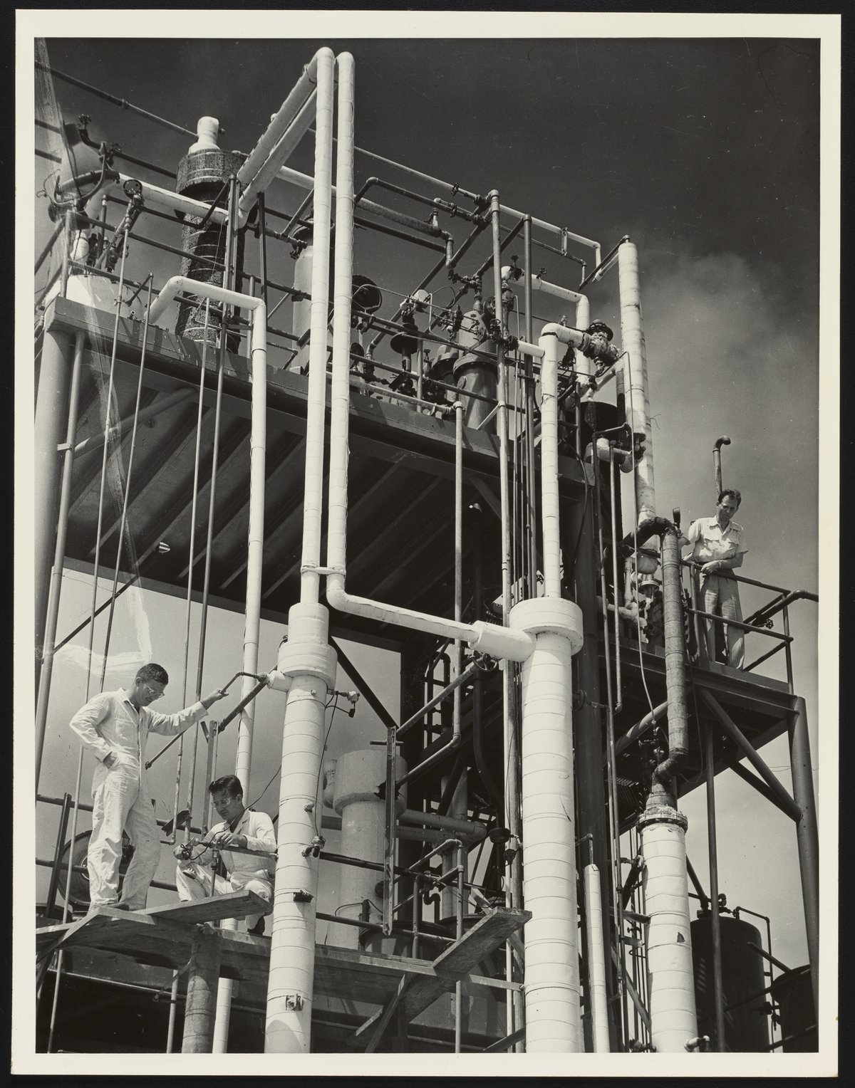 General view of three unidentified employees at work at the Dow Chemical Company Texas Division plant located in Freeport, Texas. A range of products and processes were researched, developed, and produced at the plant, including chlorination, phenol, and magnesium.