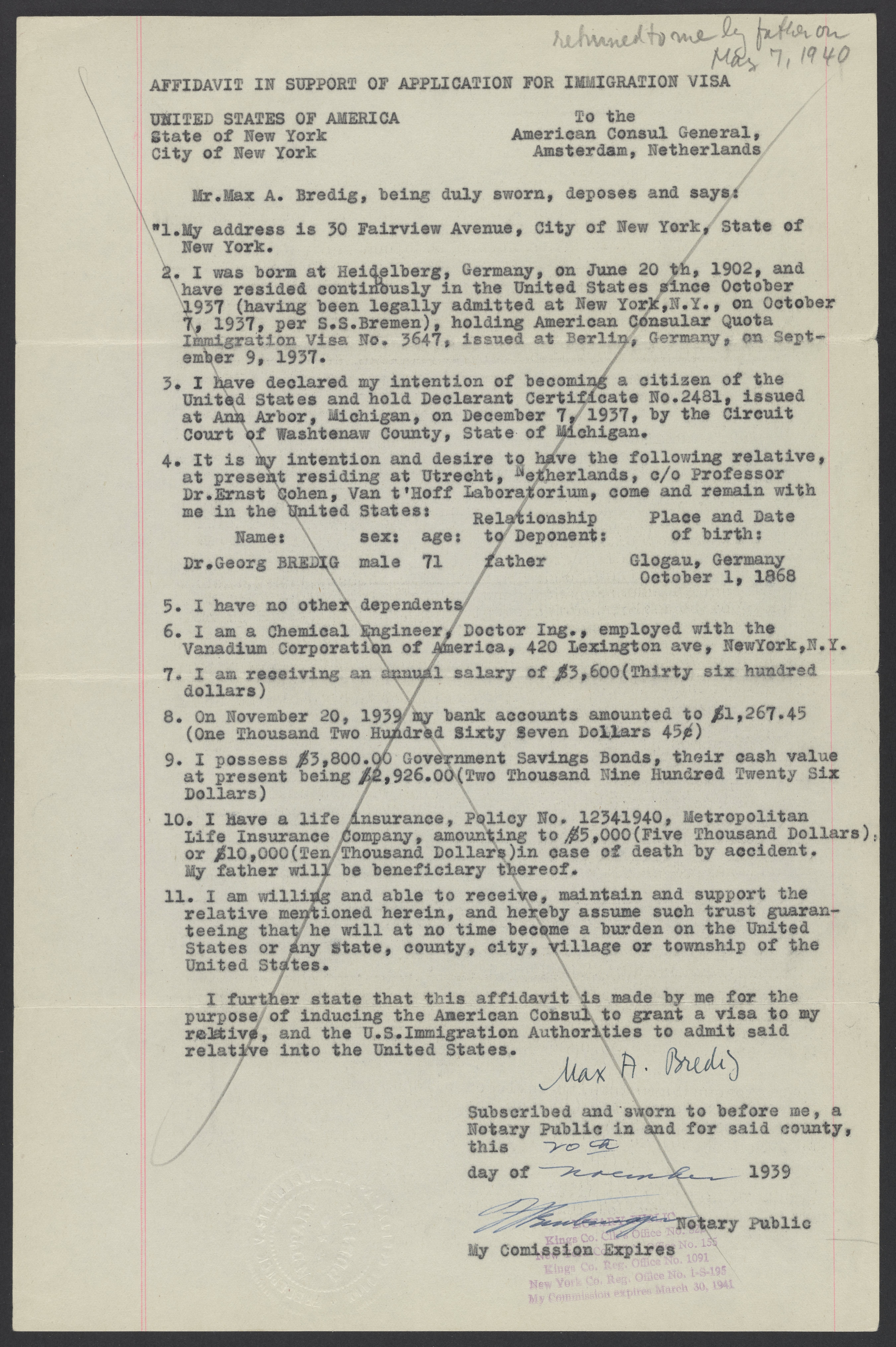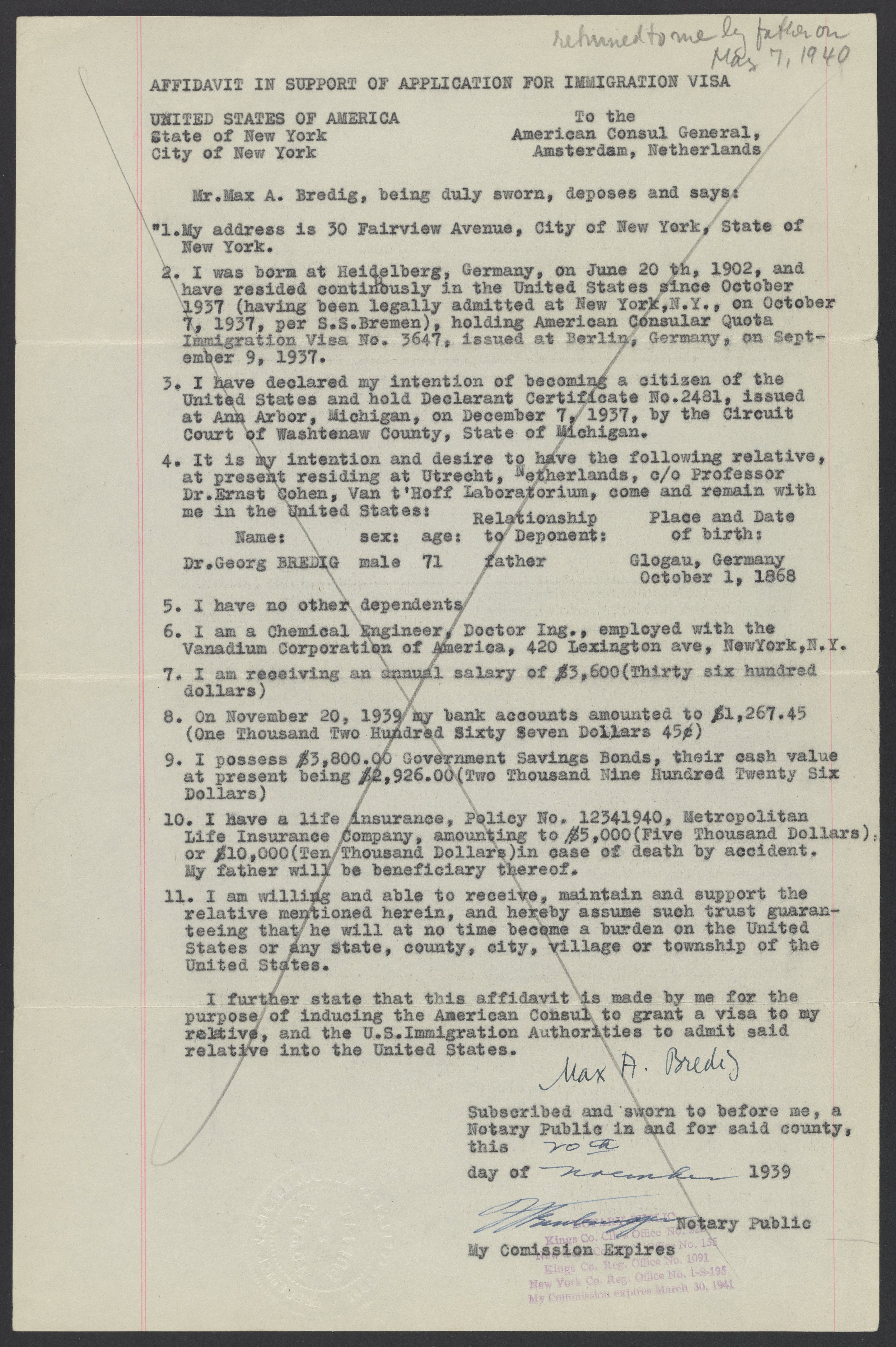Affidavit in support of Georg Bredig's (1868-1944) application for an immigration visa, by his son, Max Albert Bredig (1902-1977). The affidavit contains information about Max Bredig's immigration, place of work, and financial status. One of four copies is digitized.