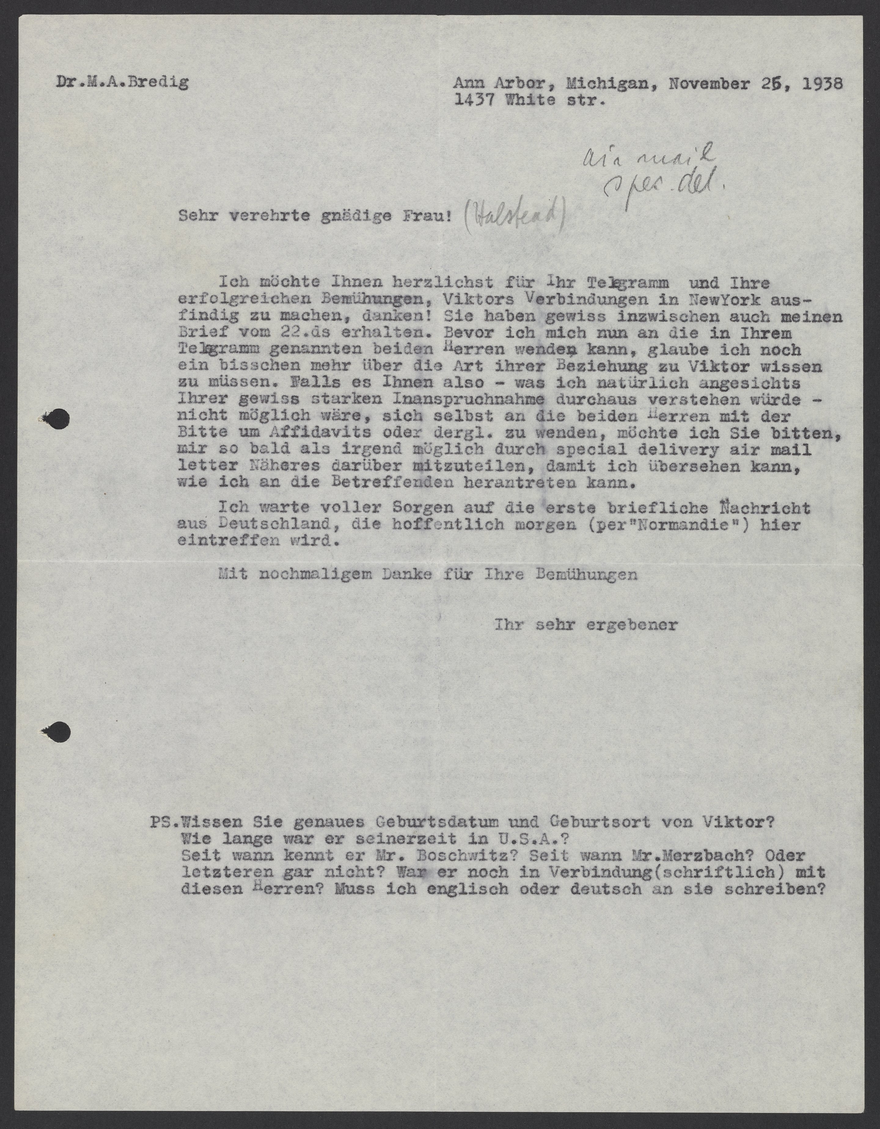 Ich möchte Ihnen herzlichst für Ihr Telegramm und Ihre erfolgreichen Bemühungen, Viktors Verbindungen in New York ausfindig zu machen, danken! Sie haben gewiss inzwischen auch meinen Brief vom 22. ds erhalten. Bevor ich mich nun an die in Ihrem Telegramm genannten beiden Herren wenden kann, glaube ich noch ein bisschen mehr über die Art ihrer Beziehung zu Viktor wissen zu müssen. Falls es Ihnen also – was ich natürlich angesichts Ihrer gewiss starken Inanspruchnahme durchaus verstehen würde – nicht möglich wäre, sich selbst an die beiden Herren mit der Bitte um Affidavits oder dergl. zu wenden, möchte ich Sie bitten mir so bald als irgend möglich durch special delivery air mail lettter Näheres darüber mitzuteilen, damit ich übersehen kann, wie ich an die Betreffenden herantreten kann.