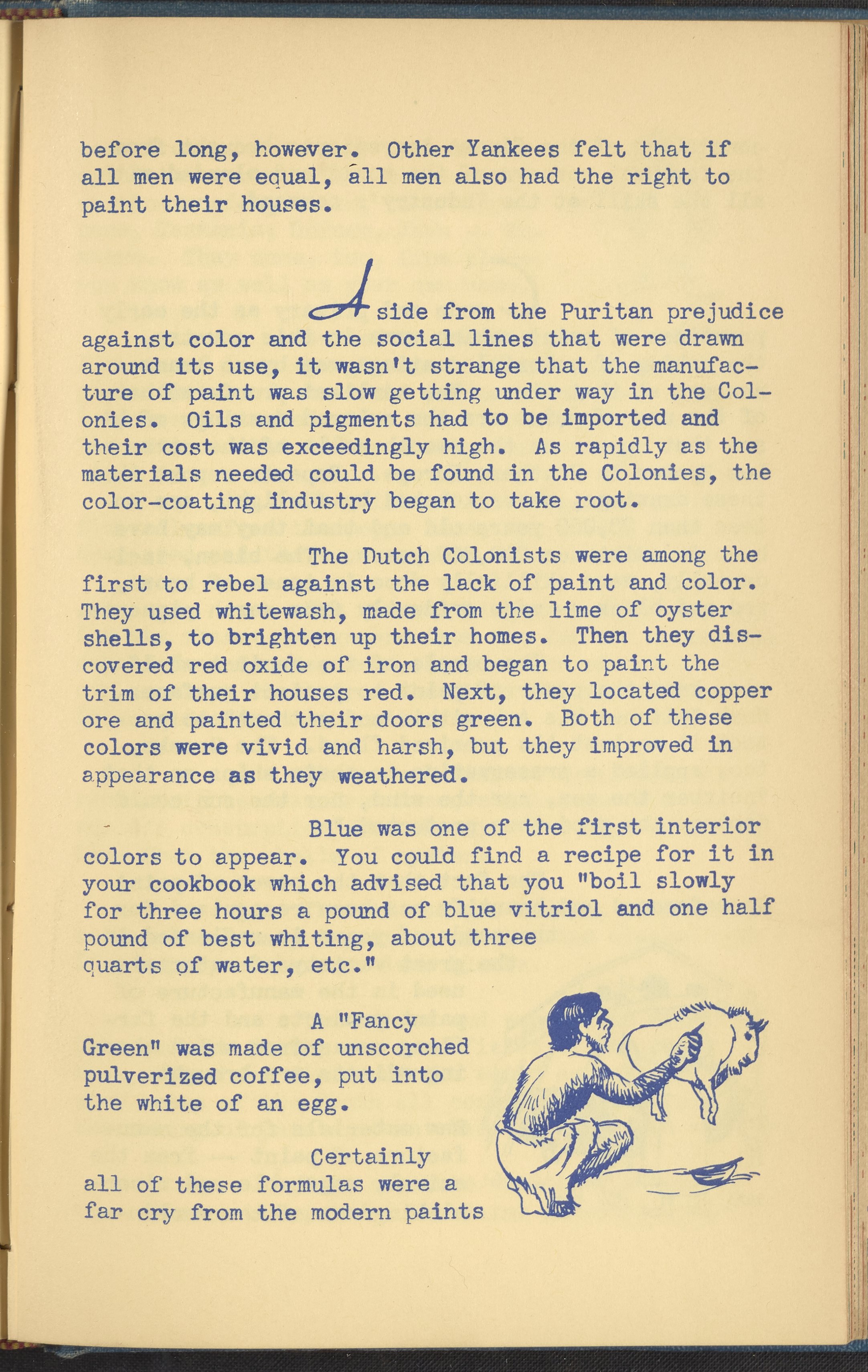 Booklet corresponding to a radio broadcast program created by the National Paint, Varnish, and Lacquer Association. The booklet begins by discussing the history and use of paint and color during the colonial period of the United States. Describes paint-making practices, then, lists sources of paint products such as the animal kingdom or mineral kingdom. For example, beeswax from bees, or chalk from the Chalk Cliffs of Dover. Finally, describes how modern construction is made possible by the protection of paint and varnish products. Includes small stylized illustrations throughout and decorated covers.